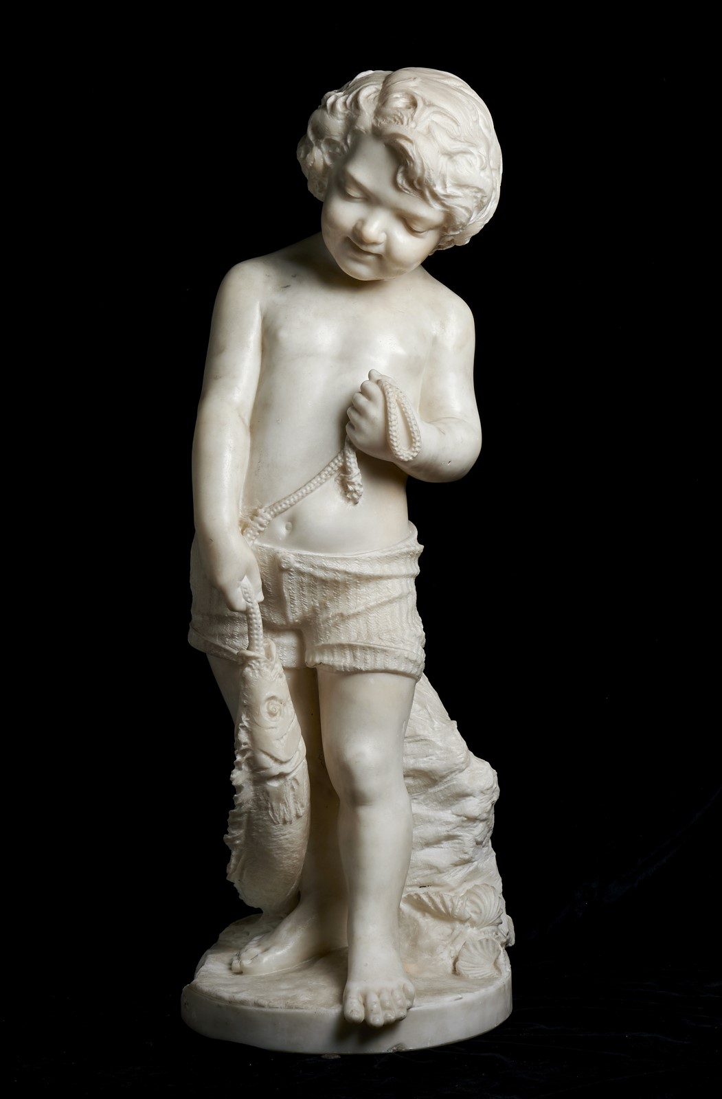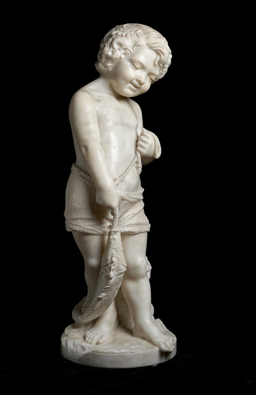 SCULTORE ITALIANO DEL XIX SECOLO Giovane pescatore in marmo bianco. . Cm 80,00. Difetto alla base.