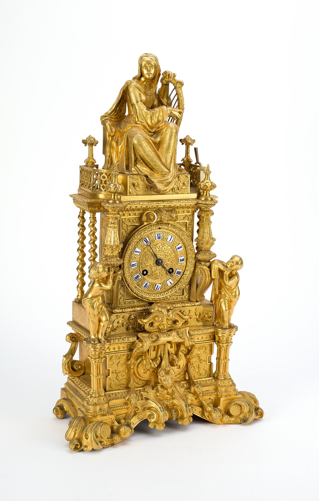 MANIFATTURA FRANCESE DEL XIX SECOLO Orologio "a tempio" in bronzo dorato sormontato da suonatrice d'arpa e con cariatidi laterali e colonne a tortiglione. . Cm 26,00 x 48,00 x 13,00.