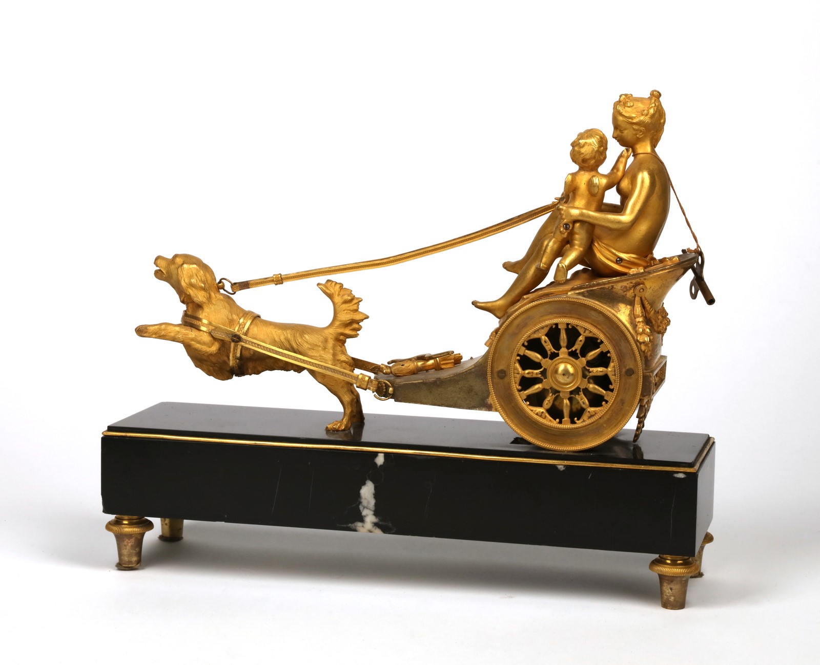 MANIFATTURA FRANCESE DEL PERIODO DELL'IMPERO Orologio da tavolo, carro di Venere. Bronzo dorato. Cm 38,00 x 32,00 x 10,50. Quadrante inserito nella cornice di una ruota in smalto bianco con numeri romani e arabi con movimento a vista visibile la scritta "a Paris"; base in marmo nero del Belgio con festone in bronzo dorato su piedini piriformi. Completo di chiave. Non funzionante.