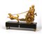 MANIFATTURA FRANCESE DEL PERIODO DELL'IMPERO Orologio da tavolo, carro di Venere. Bronzo dorato. Cm 38,00 x 32,00 x 10,50. Quadrante inserito nella cornice di una ruota in smalto bianco con numeri romani e arabi con movimento a vista visibile la scritta "a Paris"; base in marmo nero del Belgio con festone in bronzo dorato su piedini piriformi. Completo di chiave. Non funzionante.