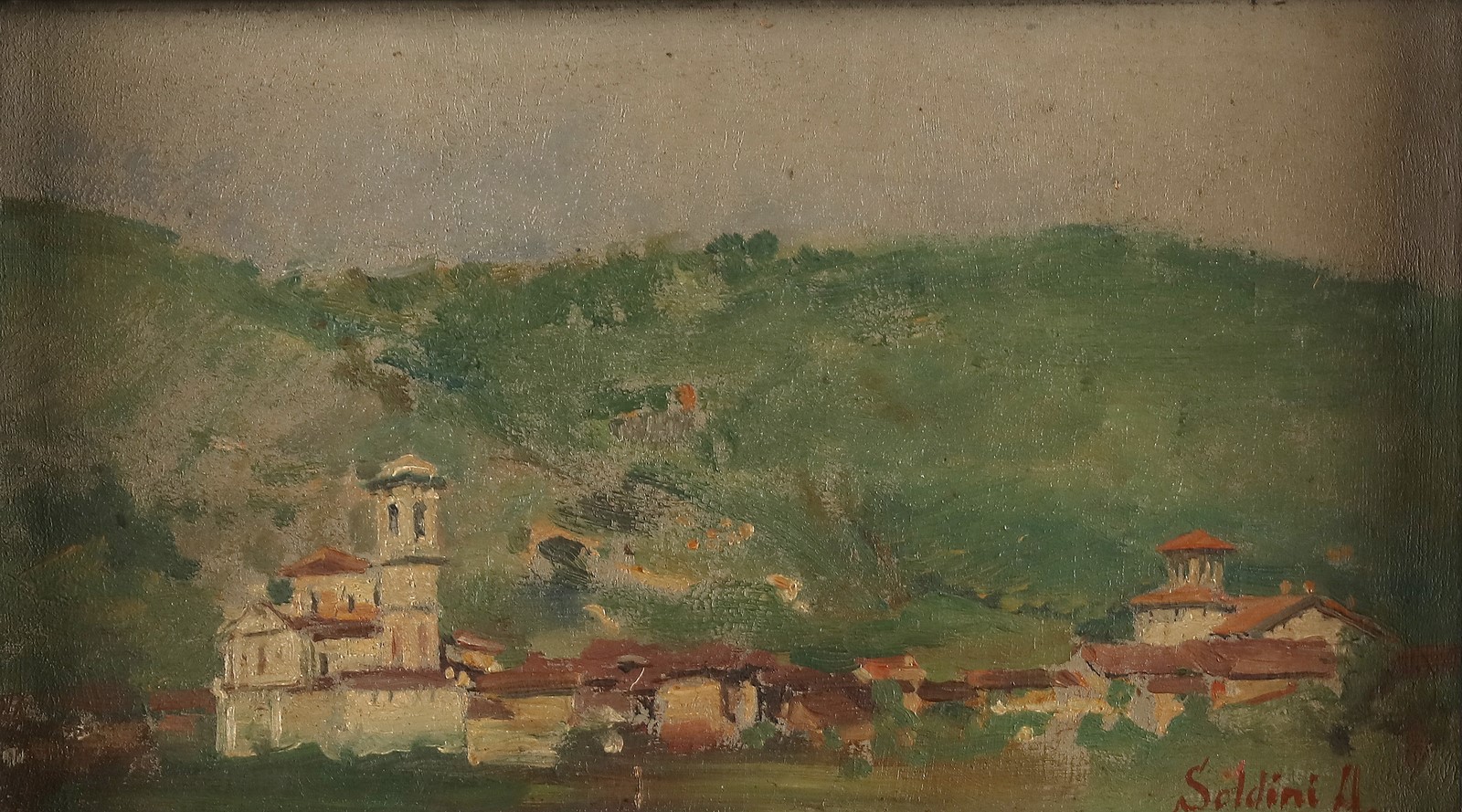 SOLDINI ARNALDO (1862 - 1936) Veduta di paese. . Olio su tavola. Cm 24,00 x 14,00. Firmato in basso a destra. . Cornice presente