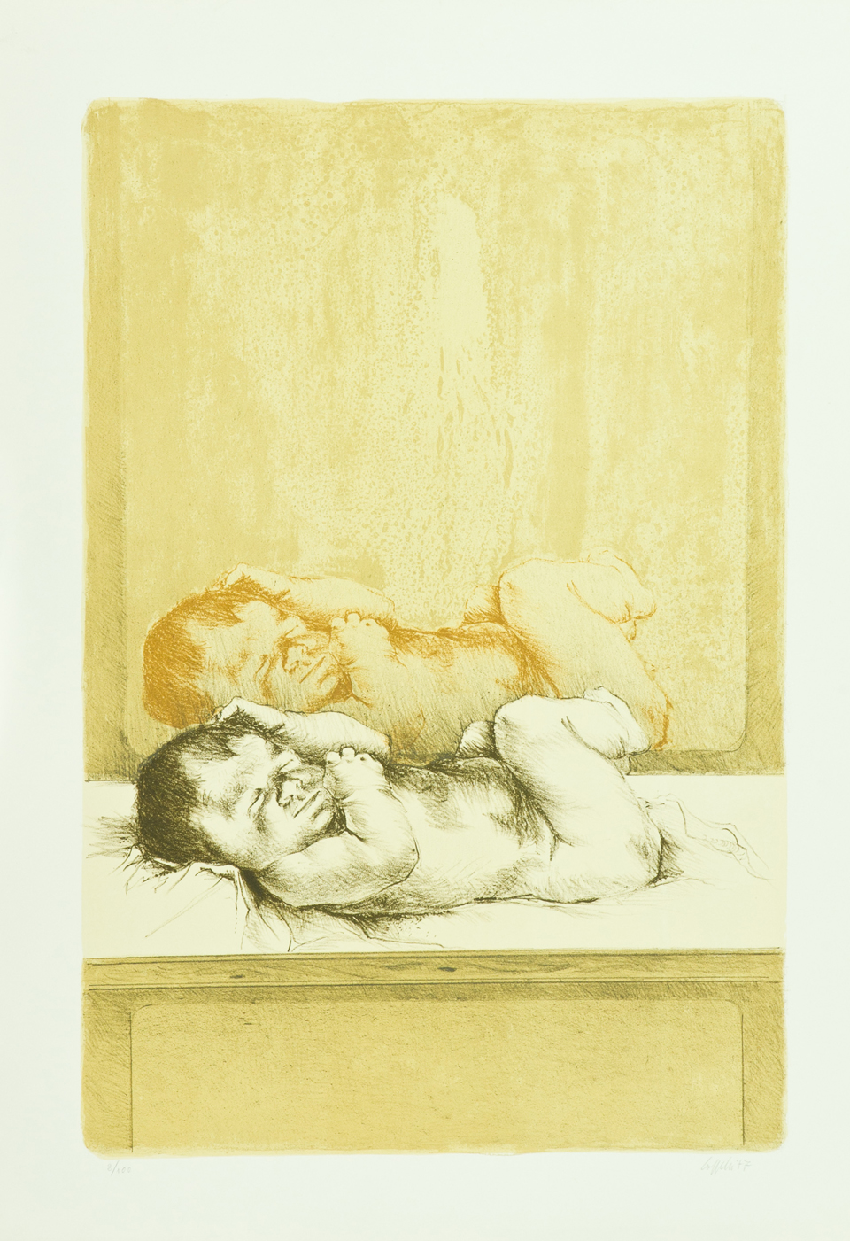Osvaldo Peruzzi Lotto unico di due Opere - "Neonato", 1977, Litografia su carta, cm. 70x50, es. 2/100, firma e data in basso a destra, tiratura in basso a sinistra; - "Figura", 1977, Litografia su carta, cm. 70x50, es. 16/100, firma e data in basso a destra, tiratura in basso a sinistra.
