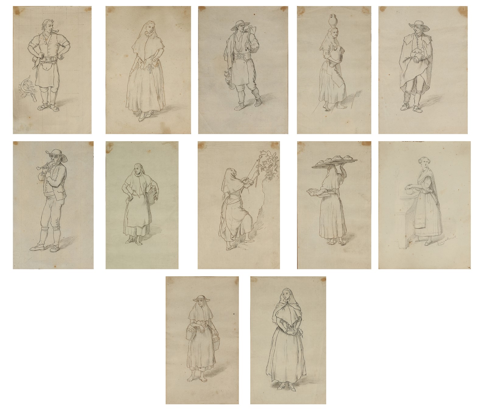 ARTISTA VENETO DEL XIX SECOLO Gruppo di 12 disegni raffiguranti personaggi in abiti ottocenteschi.