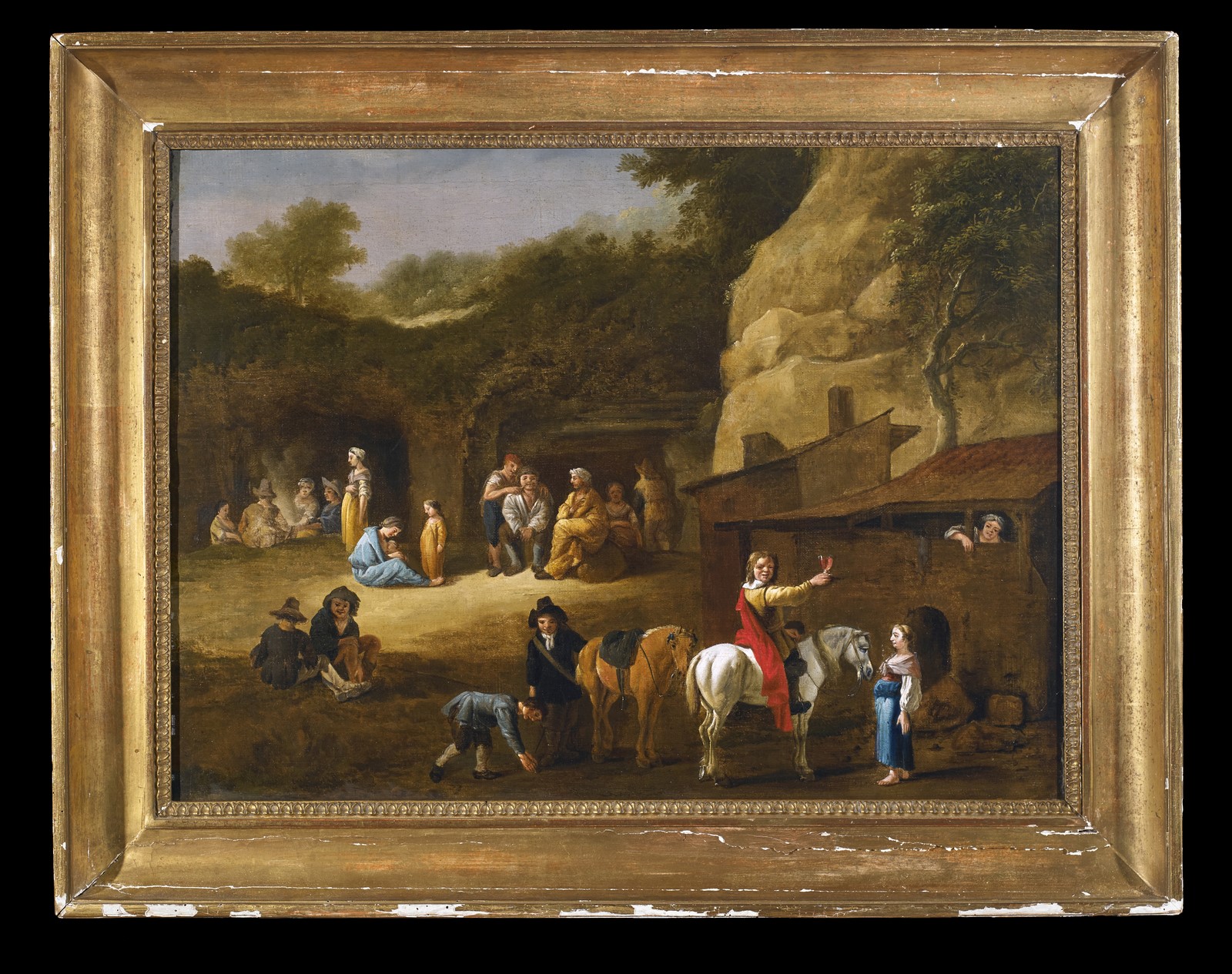 ROMAN PAINTER XVII CENTURY Scena di genere in un paesaggio. . Oil on canvas . Cm 52,00 x 68,00. . Cornice presente