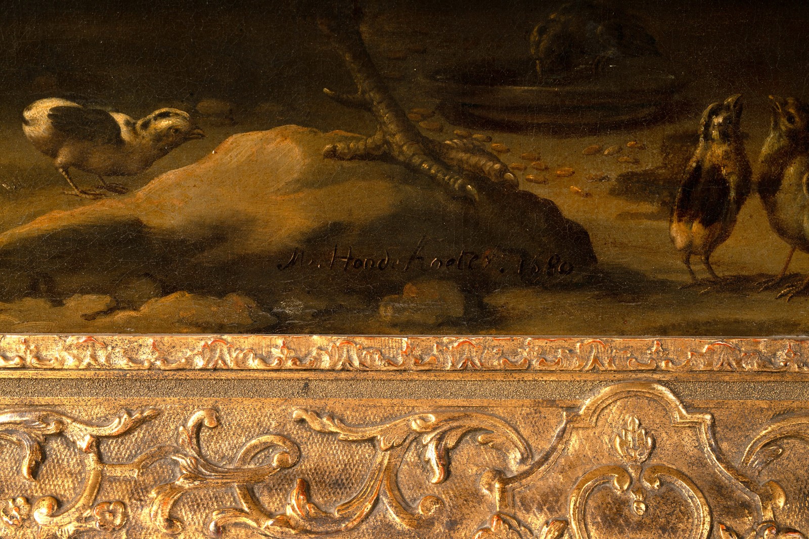 17th CENTURY NORTH EUROPE ARTIST Gallo, gallina e pulcini. . Oil on canvas . Cm 73,00 x 58,00. A firma Hondecoter e riporta la data 1680. Cornice presente