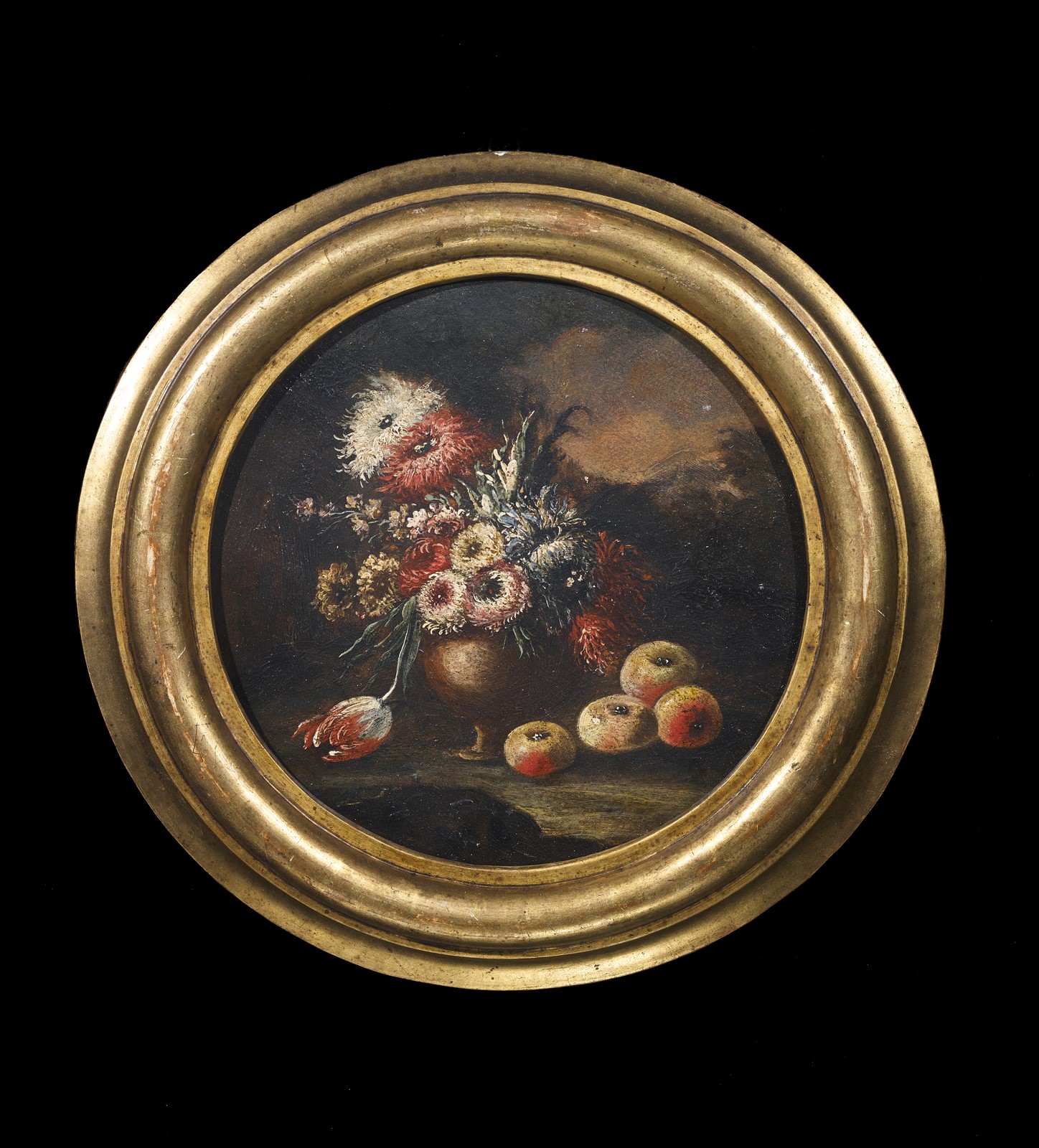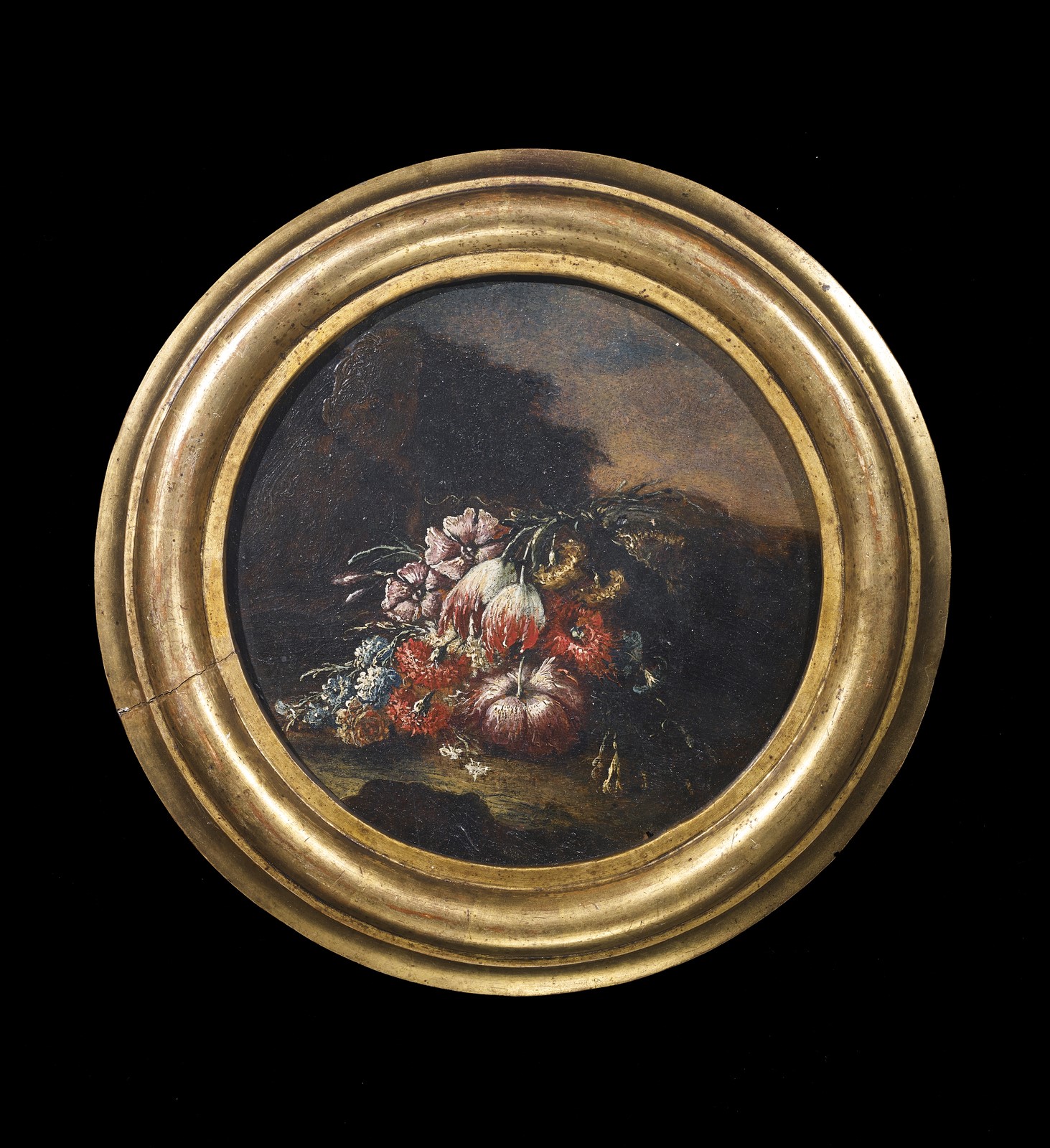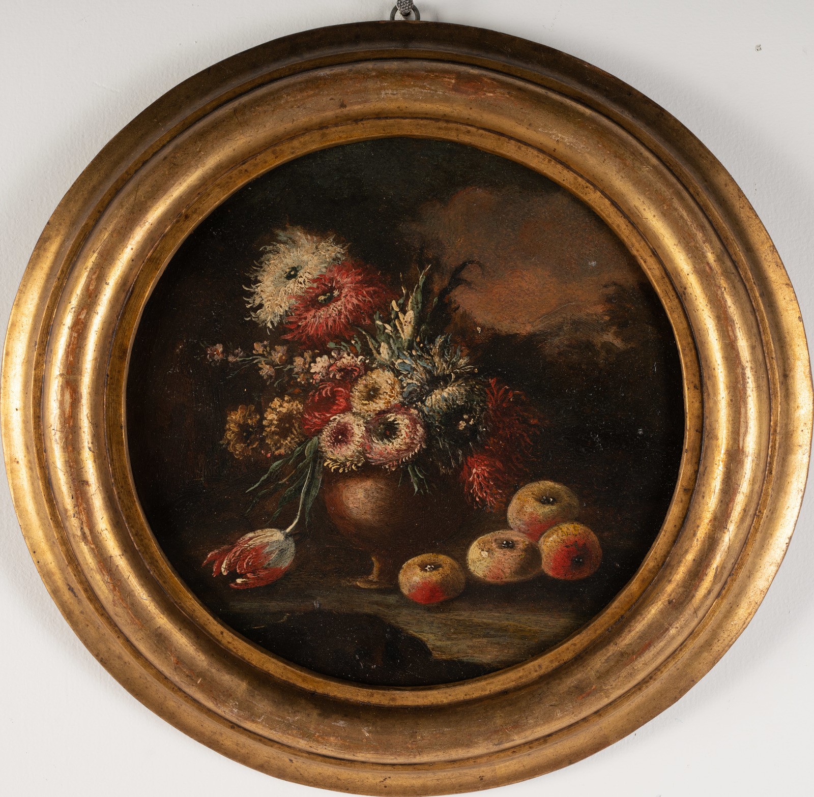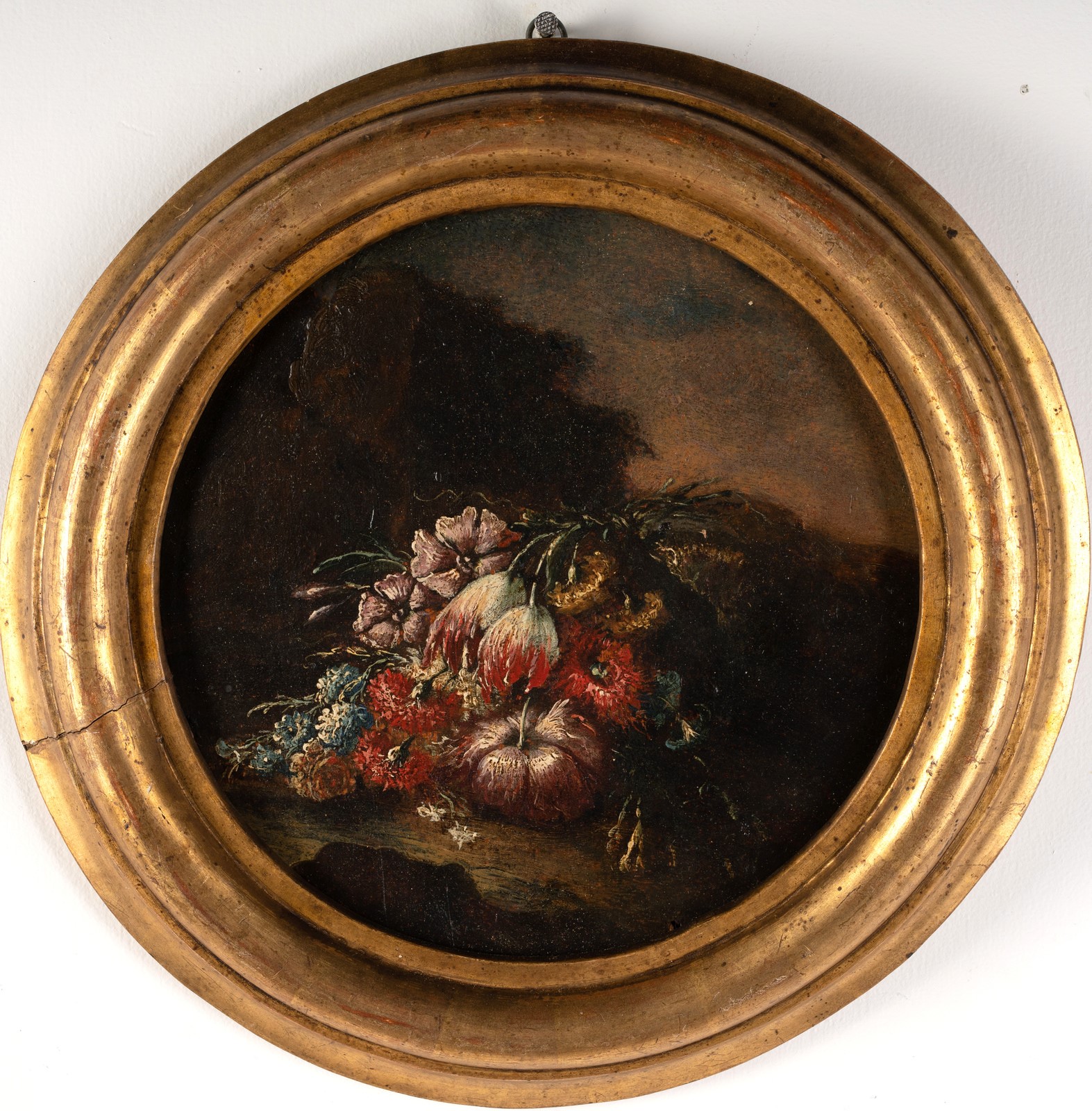 18th CENTURY NEAPOLITAN ARTIST Tre nature morte di fiori. Oil on board. Cm 21,00. In cornici dorate antiche.