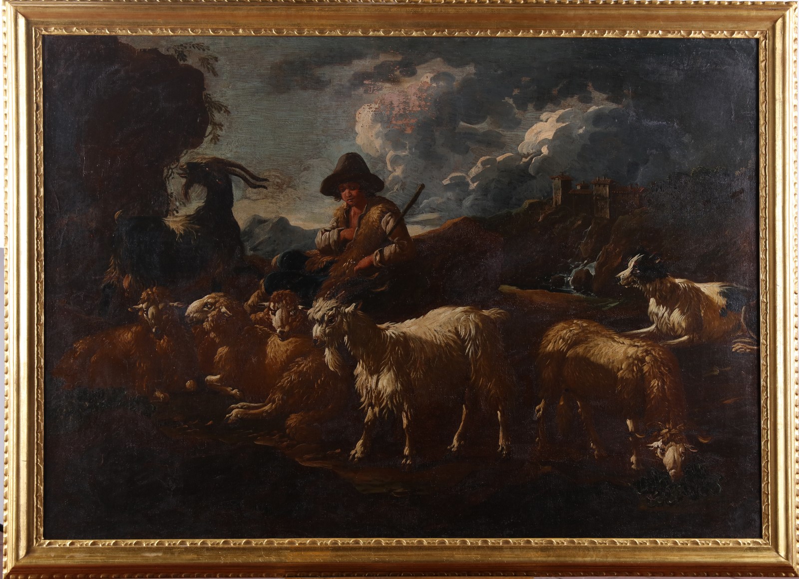 PHILIPP PETER ROOS DETTO ROSA DA TIVOLI (1657 - 1706) Pastore e gregge in un paesaggio. Olio su tela . Cm 135,00 x 97,00. . Cornice presente
