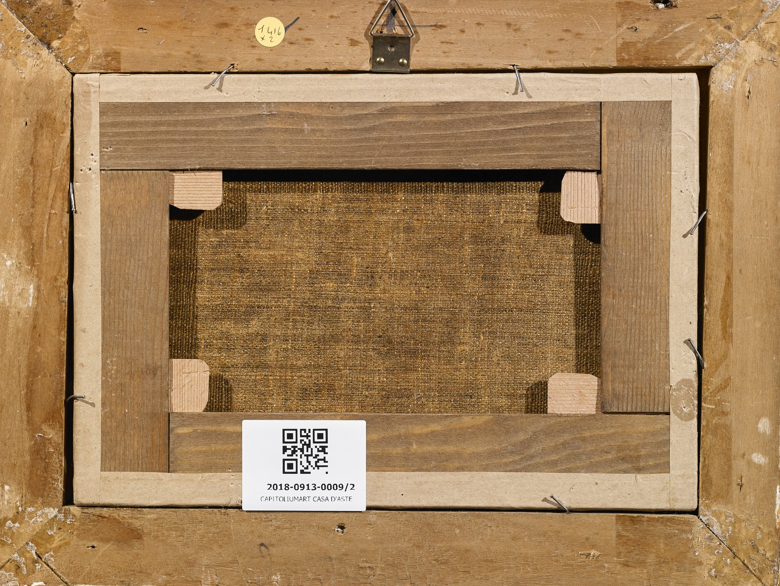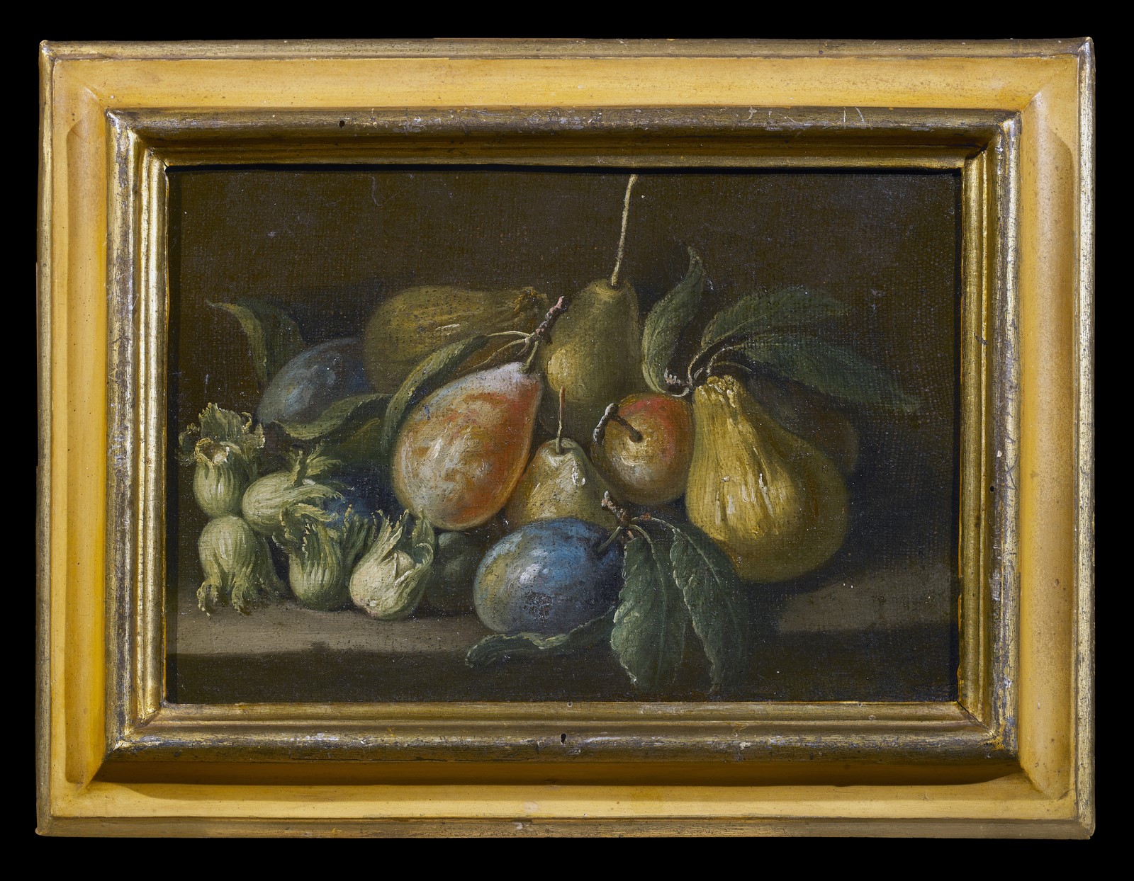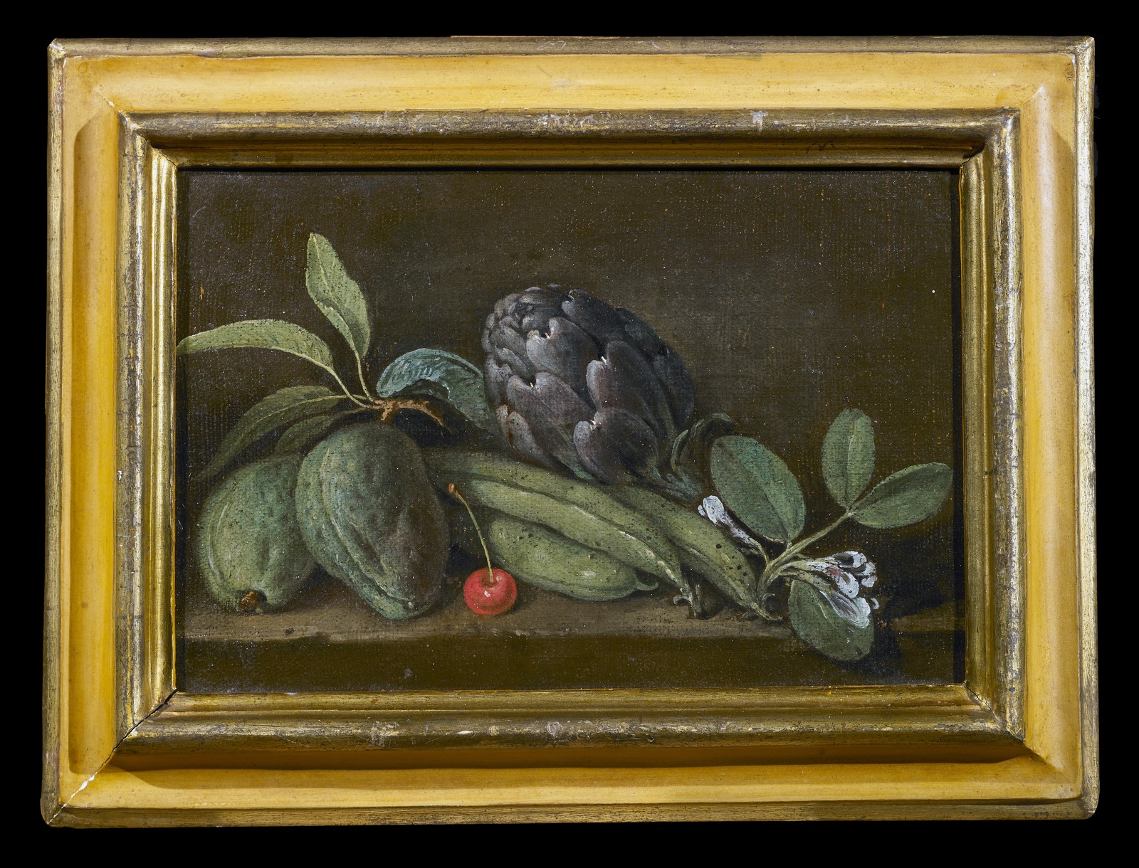 17th CENTURY ROMAN ARTIST Coppia di nature morte di ortaggi e frutta. . Oil on canvas . Cm 26,50 x 19,00. In cornici dorate antiche. Cornice presente