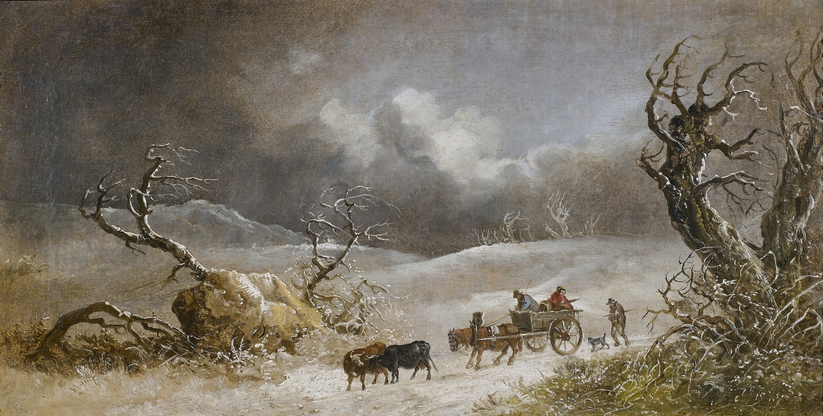 18th CENTURY ARTIST Paesaggio invernale con carro. . Oil on canvas . Cm 36,00 x 68,00. . Cornice presente