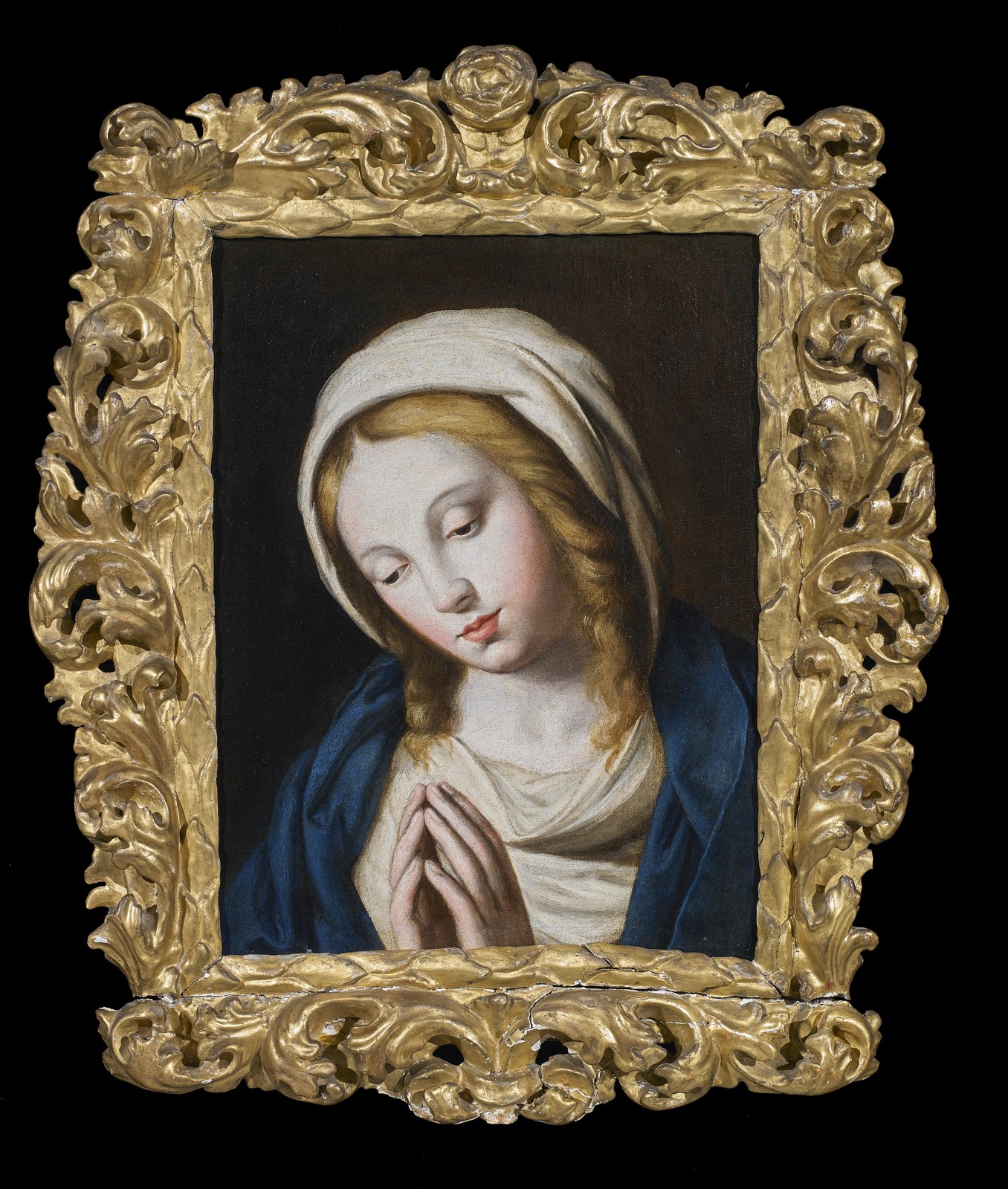 ARTISTA DEL XVII SECOLO Madonna. . Olio su tela . Cm 35,00 x 47,00. In cornice antica intagliata e dorata.