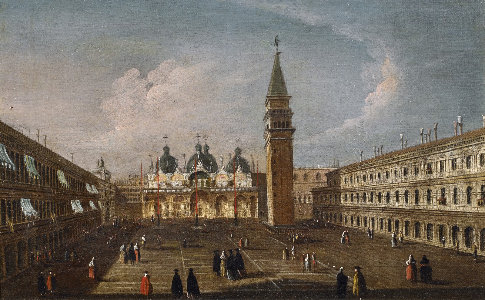 ARTISTA VENETO DEL XVIII SECOLO Piazza San Marco. Oil on canvas . Cm 47,00 x 31,00. . Cornice presente