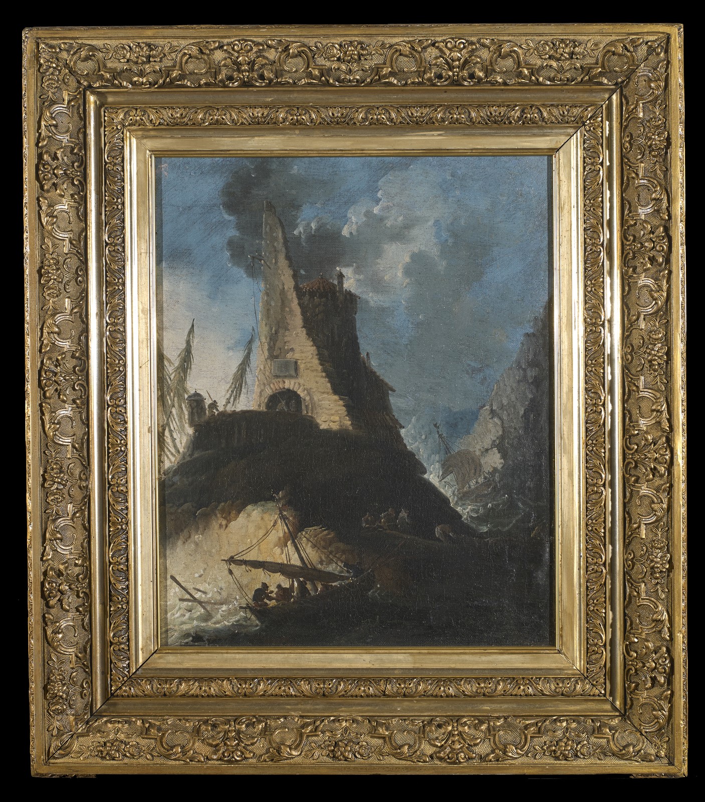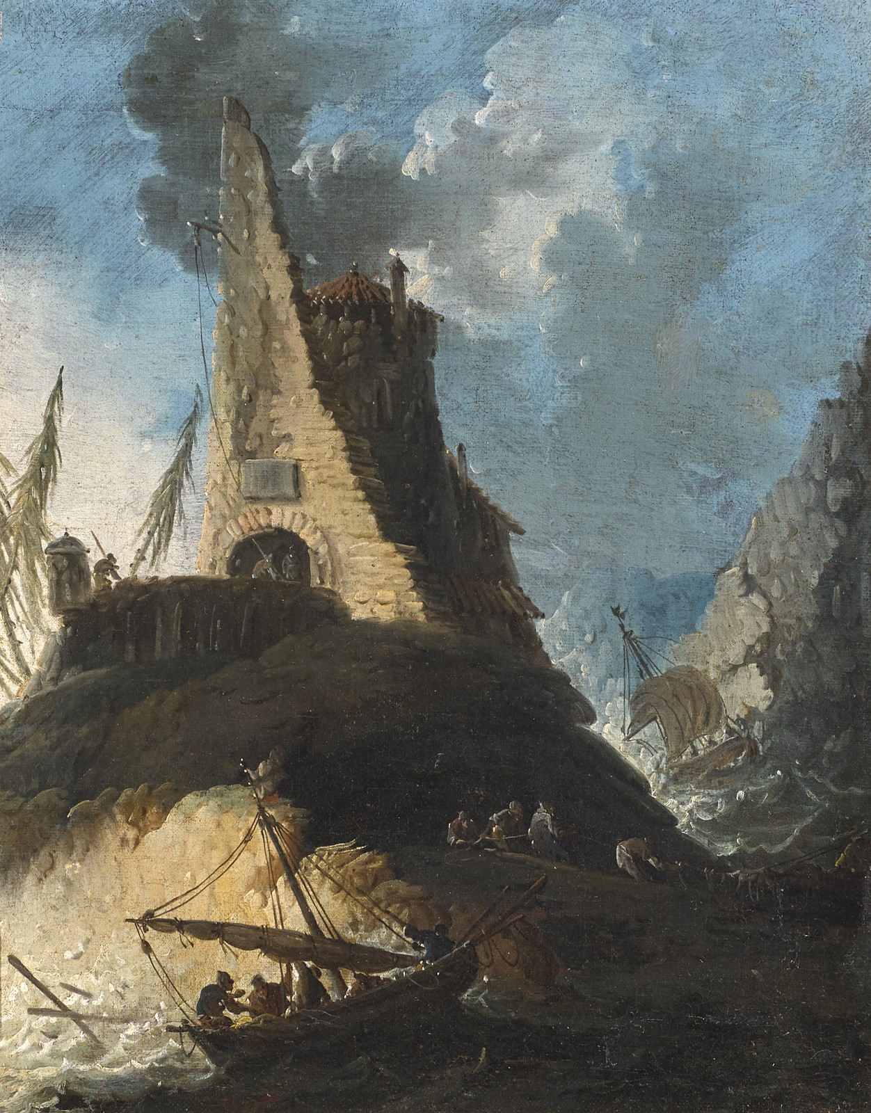 MARINI ANTONIO MARIA (1668 - 1725) Attribuito a. Paesaggio con mare in burrasca e torre. . Olio su tela . Cm 43,00 x 58,50. . Cornice presente