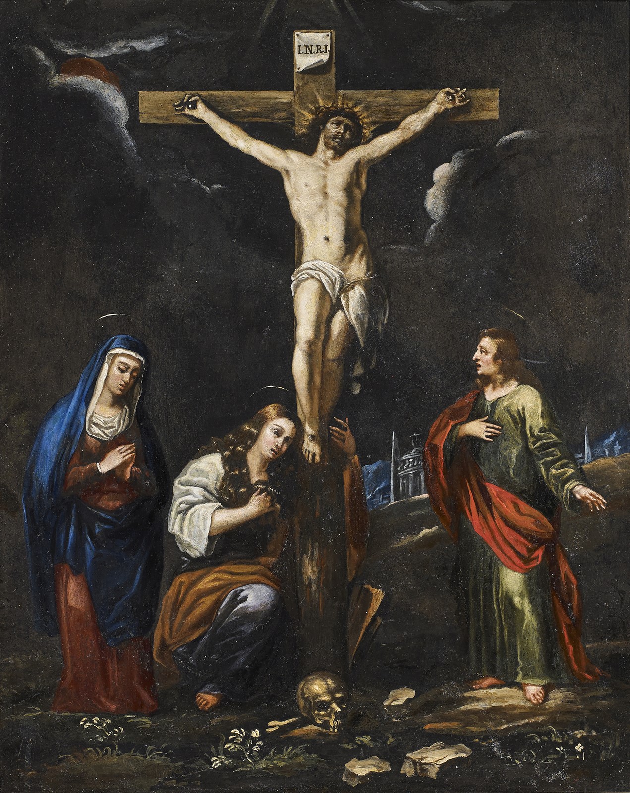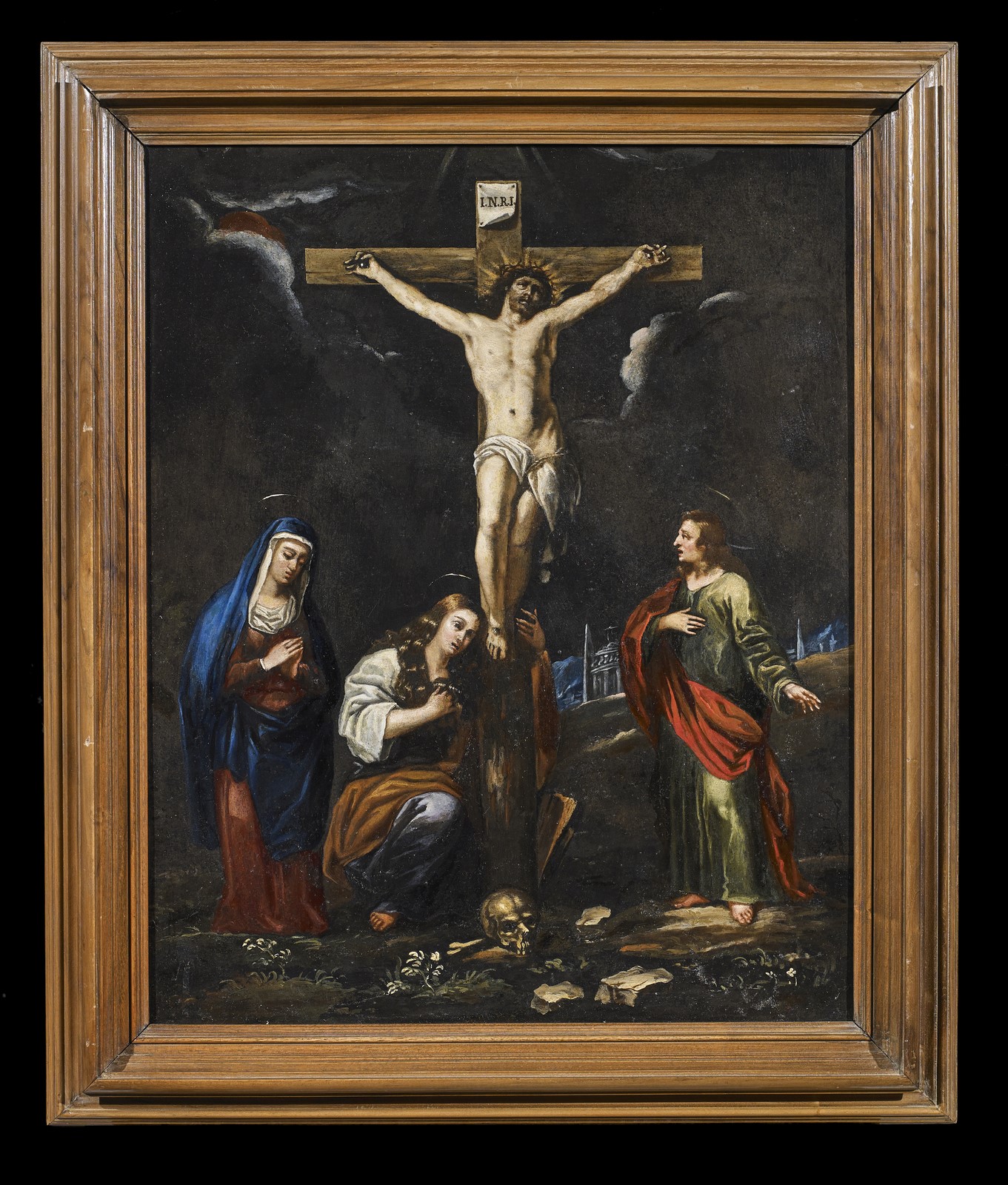 ARTISTA VENETO DEL XVII SECOLO Crocefissione. . Olio su ardesia. Cm 46,00 x 60,00.