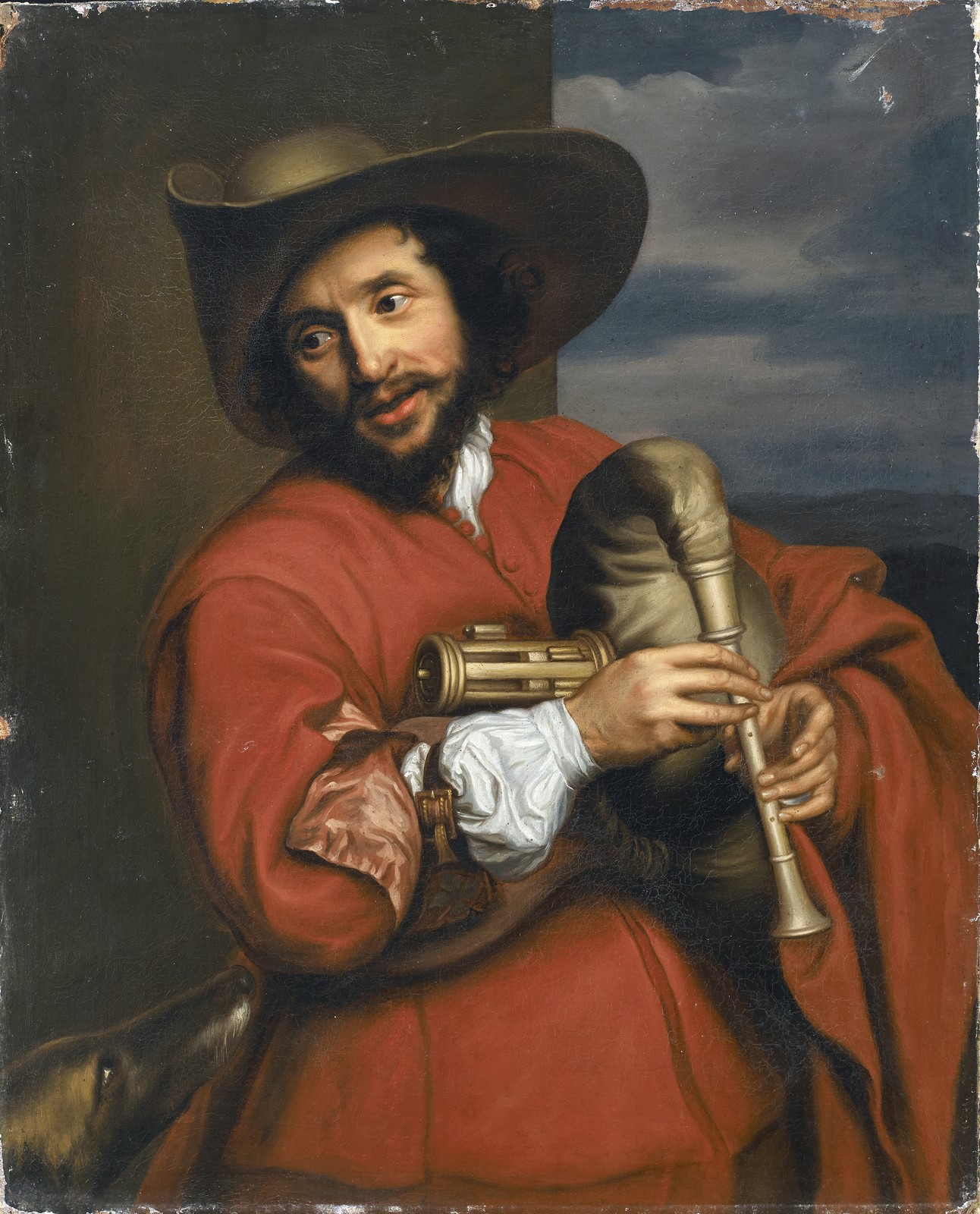 ARTISTA DEL XVII SECOLO Suonatore di zampogna. . Olio su tela . Cm 60,00 x 75,00. In cornice antica (difetti). . Cornice presente