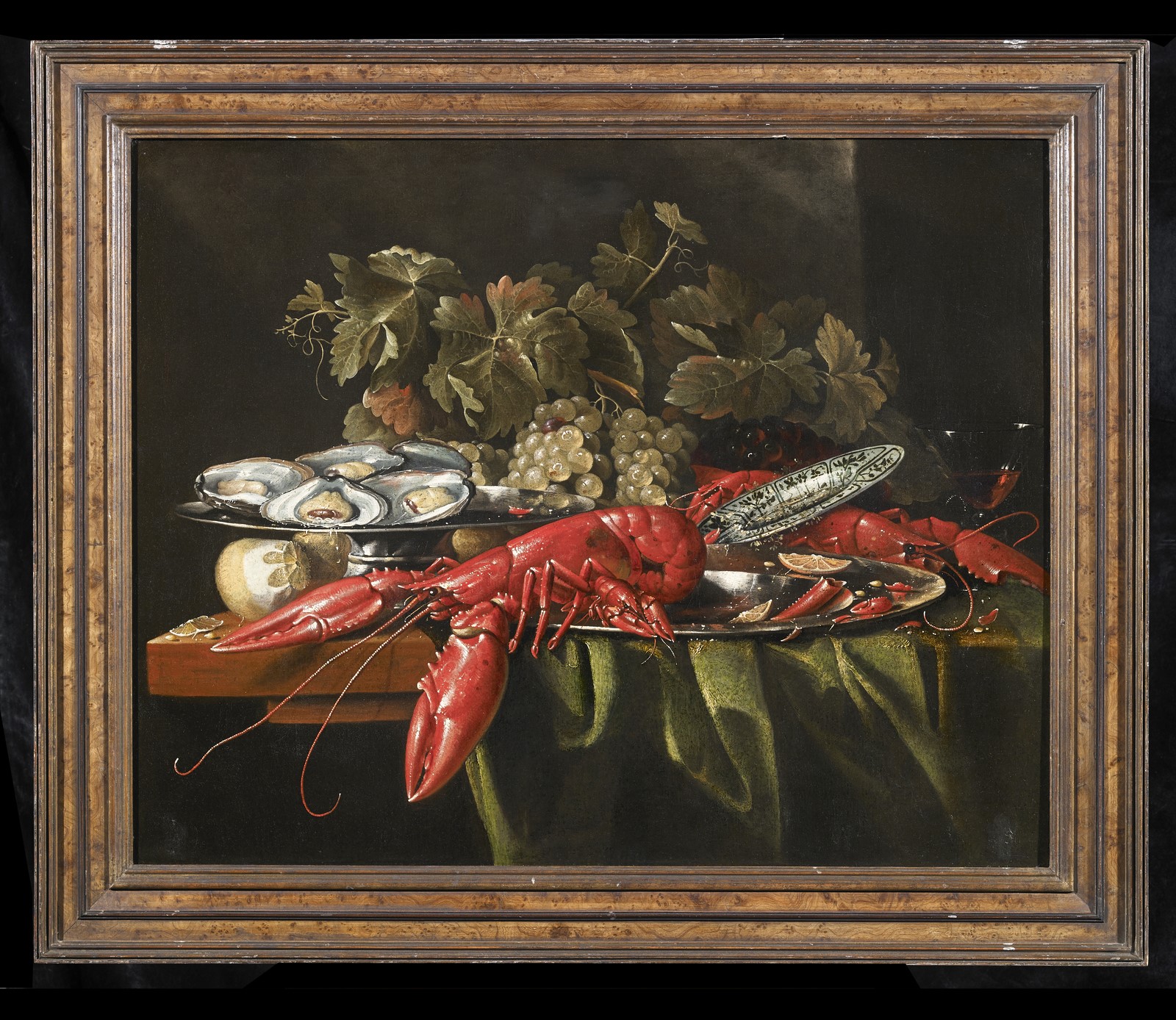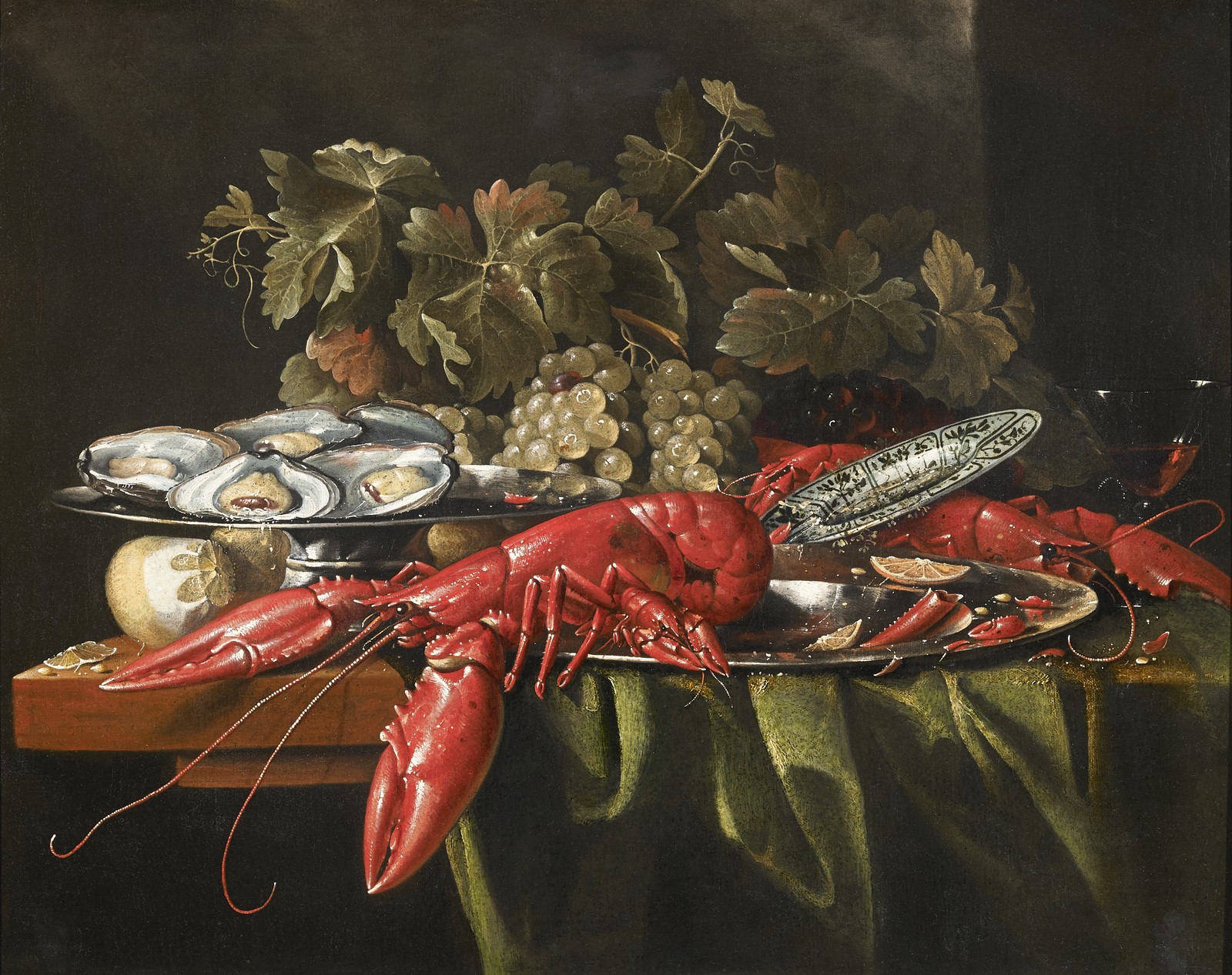 COOSEMANS ALEXANDER (1627 - 1689) Natura morta con uva, limone, ostriche e crostacei. Olio su tela . Cm 74,00 x 56,50. Provenienza
