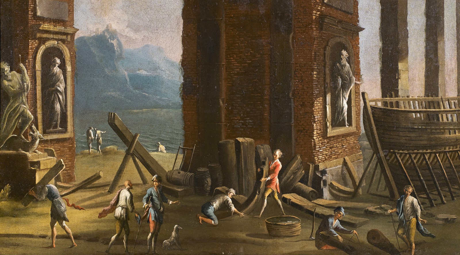 LUCIANI ASCANIO (1621 - 1706) Capriccio di rovine sul mare, con carpentieri....