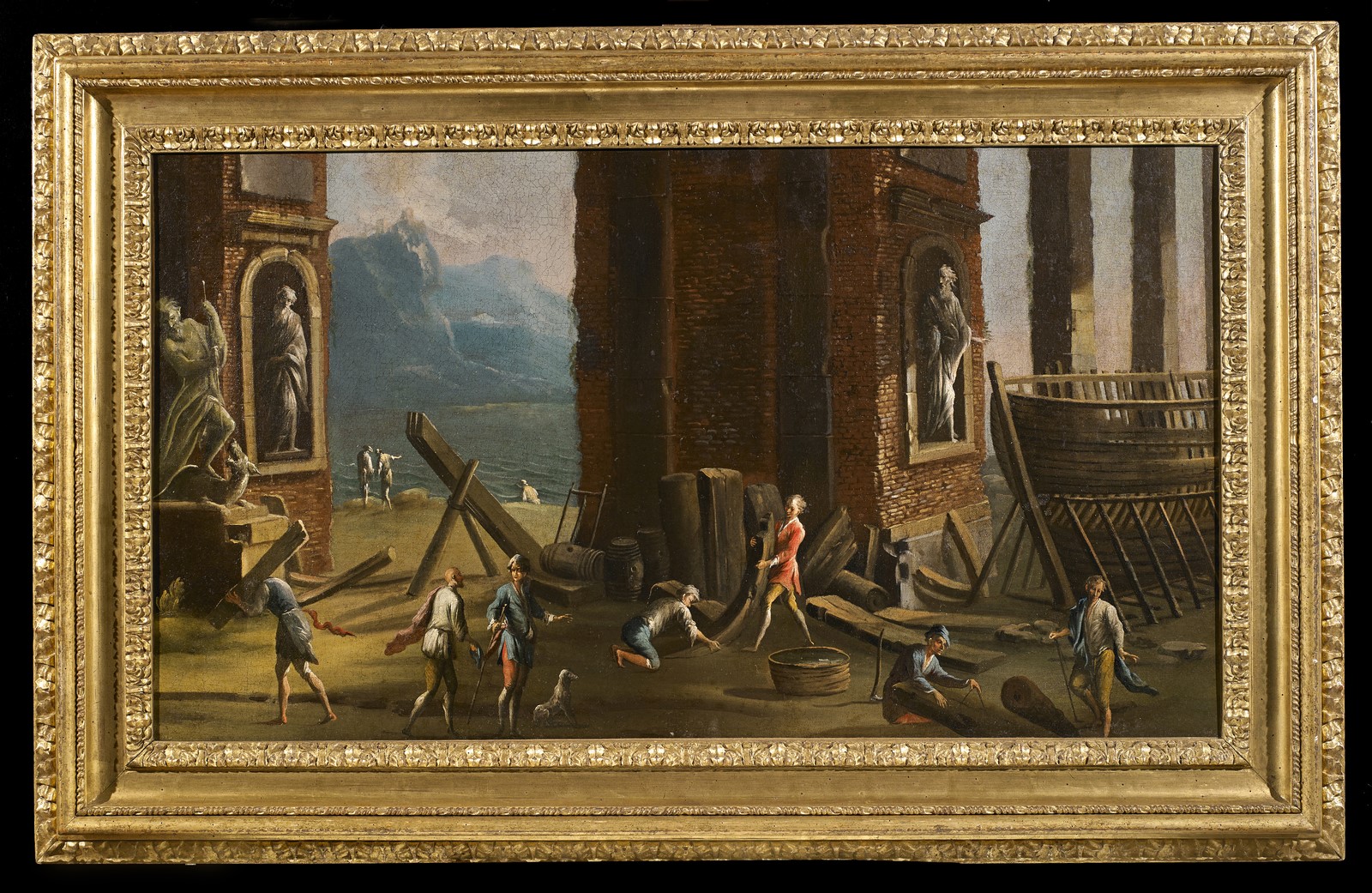 LUCIANI ASCANIO (1621 - 1706) Capriccio di rovine sul mare, con carpentieri. . Oil on canvas . Cm 106,00 x 60,00. Scheda critica di Stefano Causa, gennaio 2018. . Cornice presente