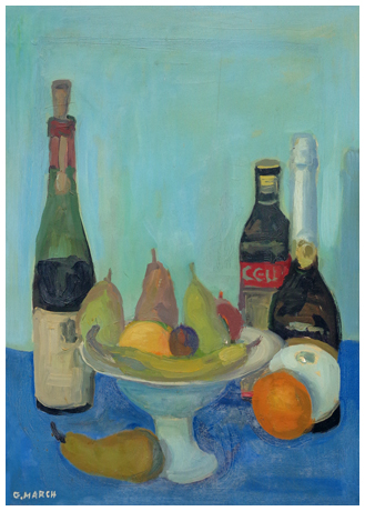 GIOVANNI MARCH Tunisi (Tunisia) 1894 – Livorno 1974 Due bottiglie, uno spumante e fruttiera con frutti. Composizione Olio su tela 70 x 50. Firma in b. a s.; sul verso firma e titolo + timbri “galleria Il Cavallo, Livorno”. A OFFERTA