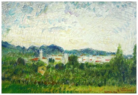 UMBERTO VITTORINI Barga 1890 – Milano 1979 Visione di Barga dal Pian Grande 1974 Olio e tec. mista su tela 40 x 60. Località, data e firma in b. a d.; sul verso etichetta con firma, titolo, scritta studio dell’artista e data. A OFFERTA