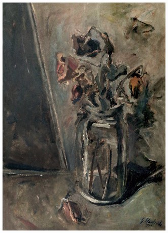 GIUSEPPE MANFREDI Seravezza 1934 – Montecatini Terme 1987 Senza titolo 1971 ca. Olio su cartone intelato 70 x 50. Firma in b. a d.; sul verso dedica e firma. base: 100