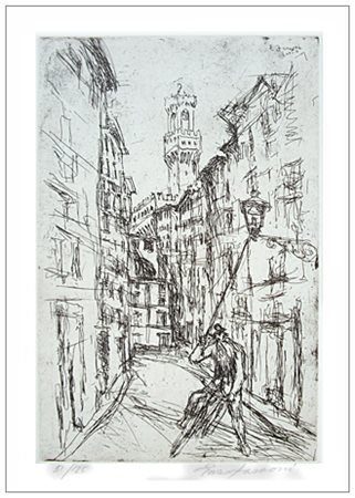 ENZO FARAONI Santo Stefano Magra 1920 – Firenze 2017 Il luciaio Acquaforte es.51/125. Firma in b. a d. (50 x 35 foglio – 39,5 x 24,5 inc.) Tiratura: 125 es. num, arabi + XXV es. num. romani su carta Graphia delle Cartiere Sicars, Catania. Opera realizzata in esclusiva per la Silfi s.p.a. (Società Illuminazione, Firenze 1985-2005) e stampata a mano presso la Stamperia d’Arte Vittoria Pozzi, Firenze; corredata di cartellina descrittiva. base: 50