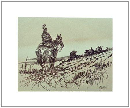 GIOVANNI FATTORI Livorno 1825 – Firenze 1908 Lanciere in vedetta 1884 Litografia a penna su fondino. Firma sulla pietra in b. a d. (27, 8 x 34,2 foglio - 19,5 x 25,7 lito.) L’opera fa parte della cartella 20 Ricordi dal vero del 1884. Pubbl.: “Giovanni Fattori” catalogo mostra a cura di Andrea Baboni e Giorgio Cortenova, Palazzo Forti, Verona, 22 aprile – 20 giugno 1999, Electa Editore, Milano, 1999, p.384, n.394. base: 190