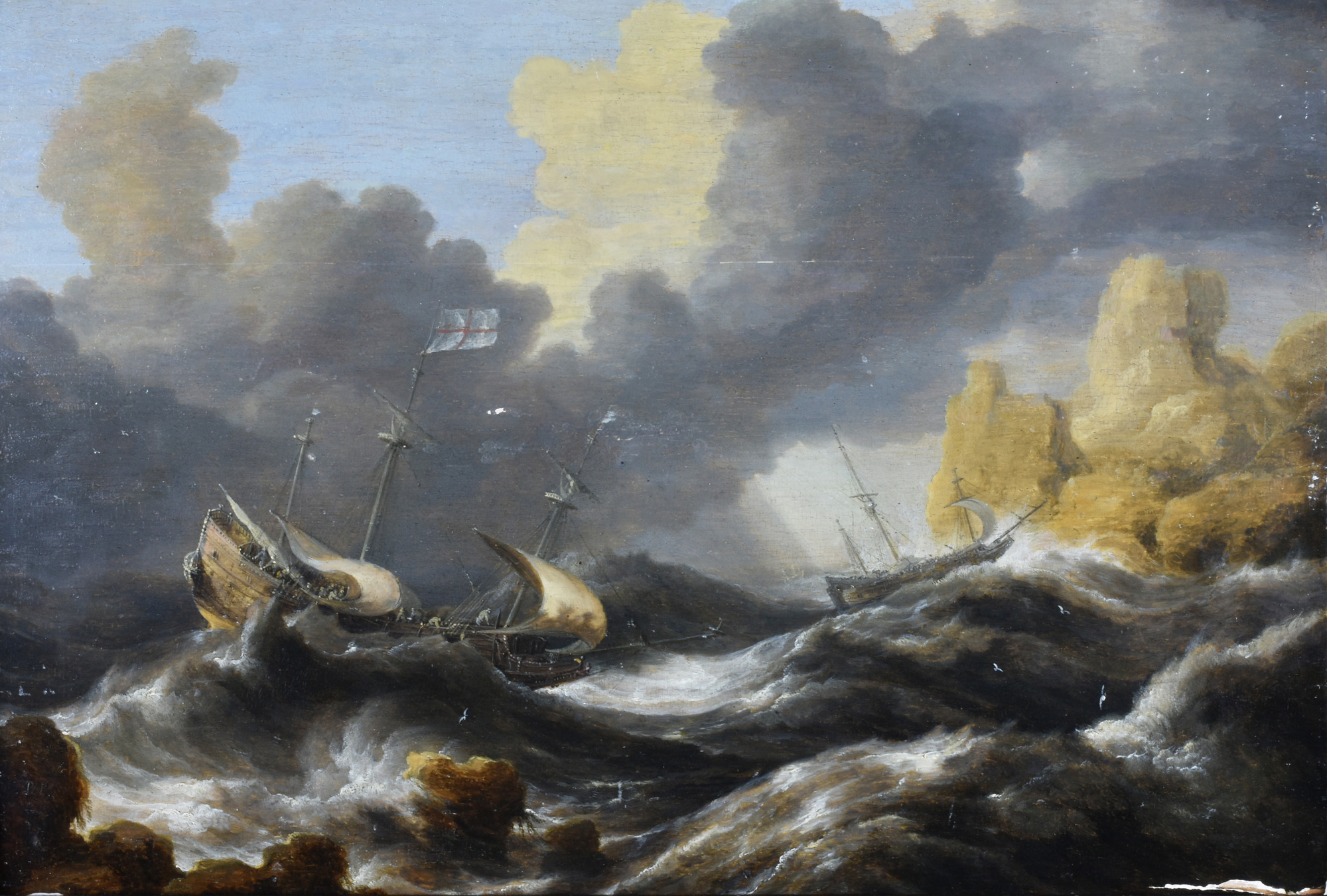 Peters Bonaventura MARE BURRASCOSO CON VASCELLI PERICOLANTI olio su tavola, cm 32,4x47,4 sul fronte: sigla B.P. difetti e cadute eseguito nel 1640 circa Provenienza Collezione Privata San Carlo Aste Torino Galleria Caretto Torino Bonaventura Peters the Elder (1614-1652) VESSELS AND A ROWING BOAT ON CHOPPY WATERS oil on panel 12,7 by 18,6 in. signed in monogram: B.P. executed in 1640 circa Provenence Collezione Privata San Carlo Aste Torino Galleria Caretto Torino Condition Report on request