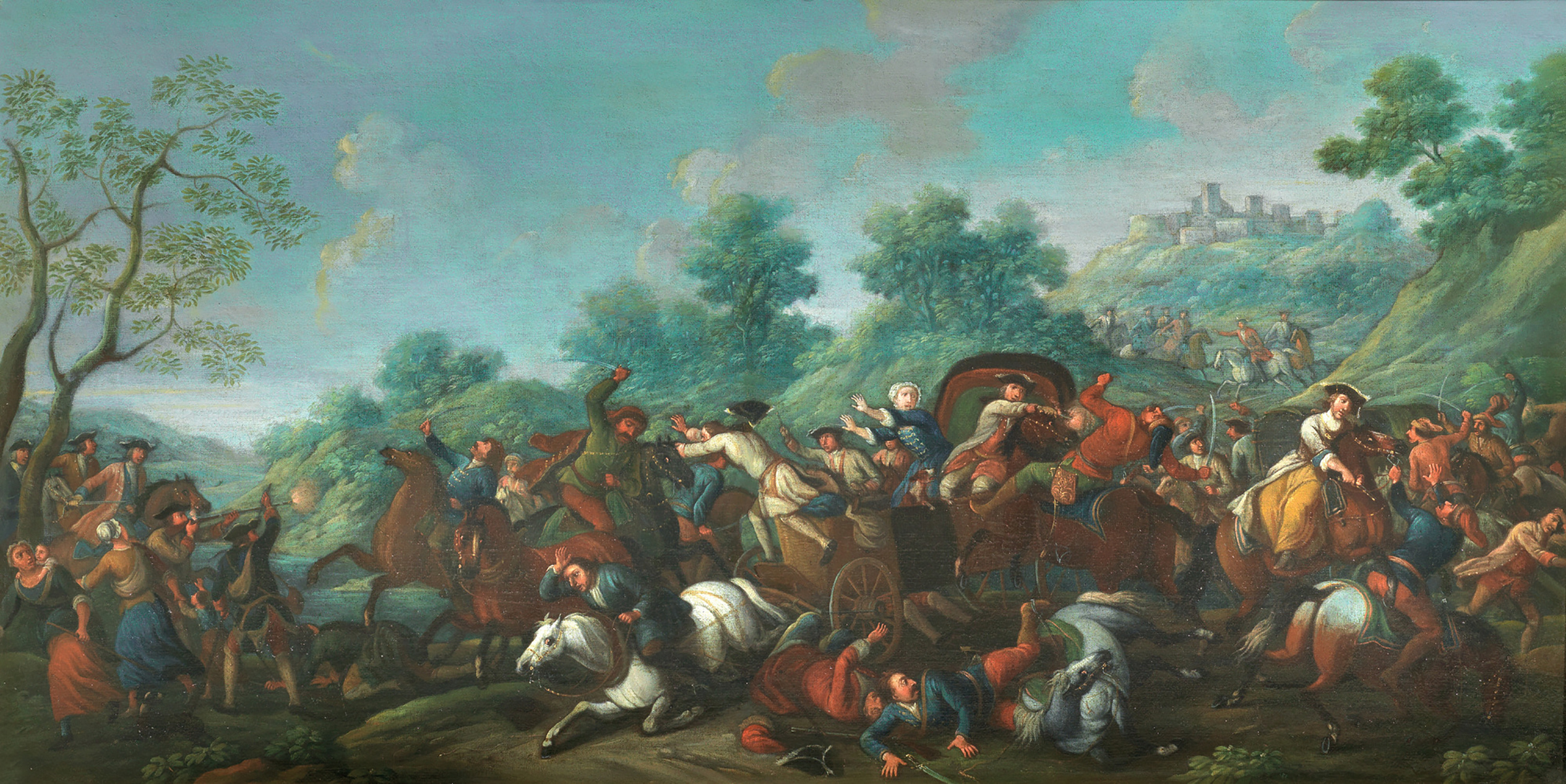 Scuola del nord Italia della prima metà del XVIII secolo L’IMBOSCATA Olio su tela, cm 65x129