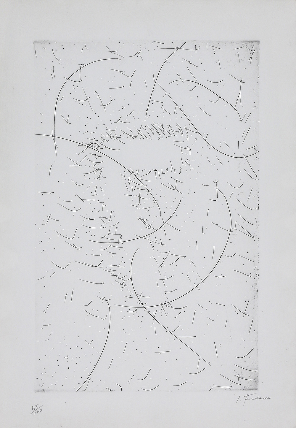 LUCIO FONTANA 1899 - 1968 Il sette magnetico, 1968 Multiplo, incisione all’acquatinta stampata su Rives, cm. 45 x 31,5 Edizione Arturo Schwarz, Milano Stampatore Giorgio Upiglio, Milano Firmato in basso a destra Prov. Collezione Privata Opera n. 45/10