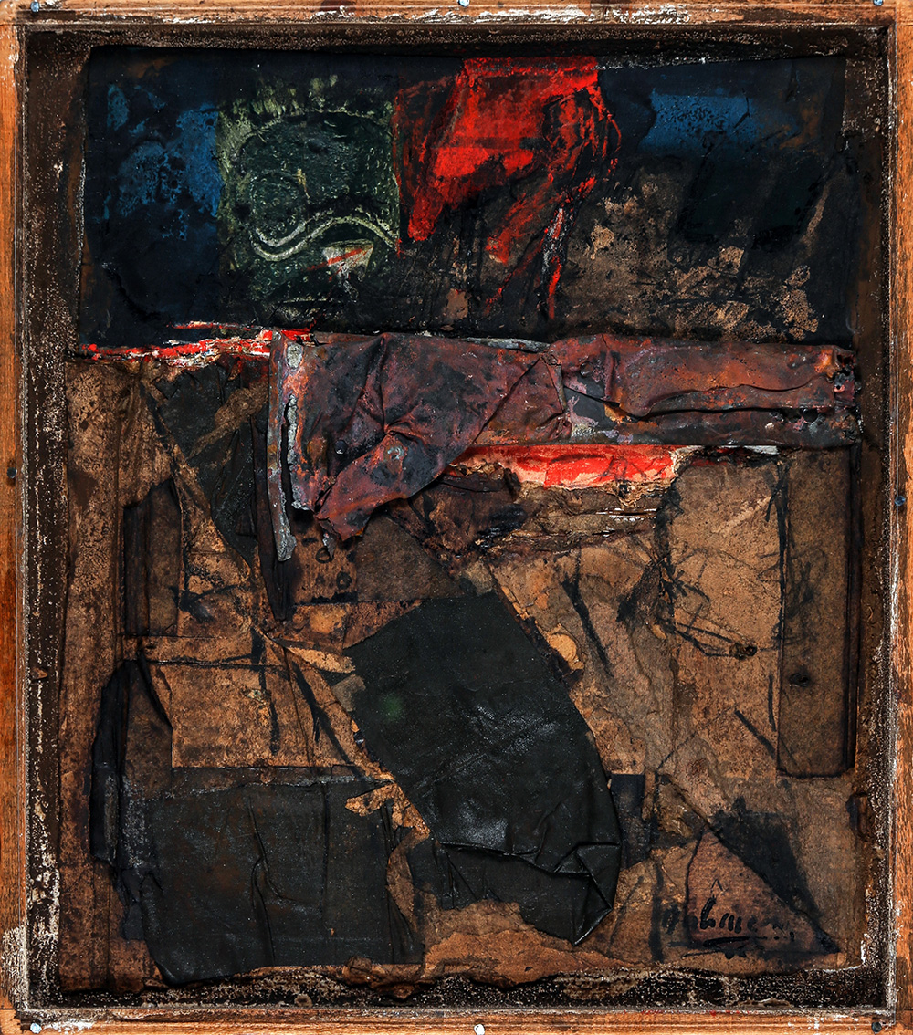 KARL FRED DAHMEN 1917 - 1981 Collage, 1963 Tecnica mista e collage di ferro, stoffa, carta in box di legno e plexiglass, cm. 42 x 37 Firmato in basso a destra Etichetta Galleria Delta, Rotterdam sul retro Prov. Collezione Privata