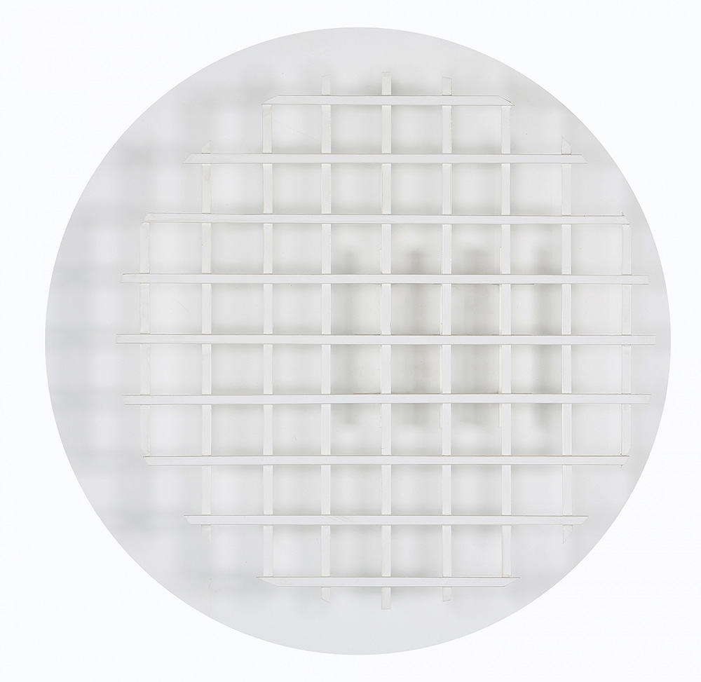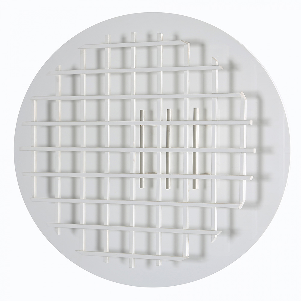 SALVADOR PRESTA 1925 Senza titolo, 1970 Griglie in plexiglass sovrapposte applicate su tavola rotonda, diametro cm. 50, profondità cm. 6,5 Firmato e datato sul retro Dedica dell’artista a Nizzi sul retro Prov. Collezione Privata