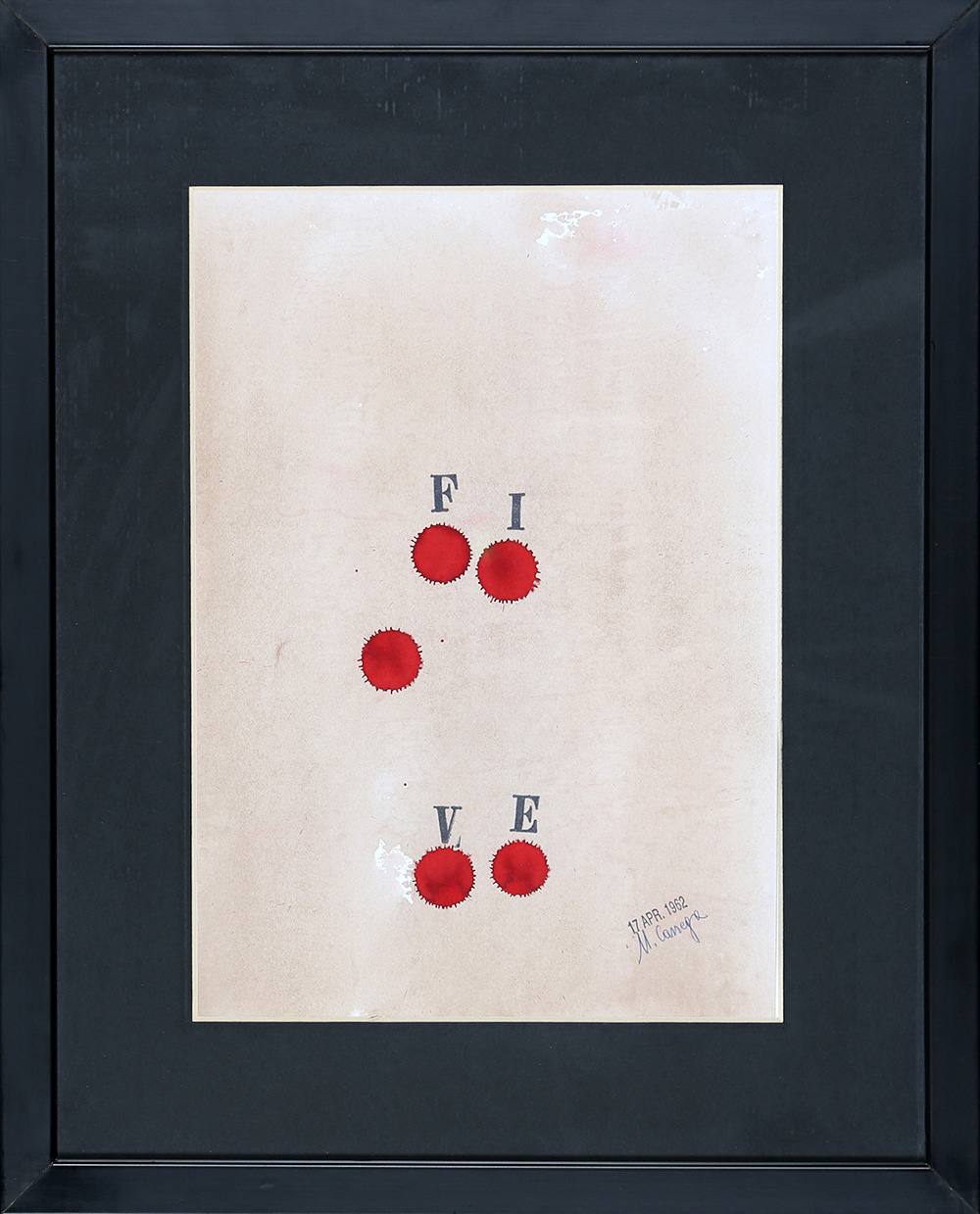 UGO CARREGA 1935 - 2014 Five, 1962 Tempera e stampi su carta, cm. 29,5 x 21 Firmato e datato in bassoa destra Prov. Collezione dell’artista Prov. Collezione Privata PUBBLICAZIONI: “Ugo Carrega - La mente in mano”, Fondazione Berardelli, 2007, p. 19