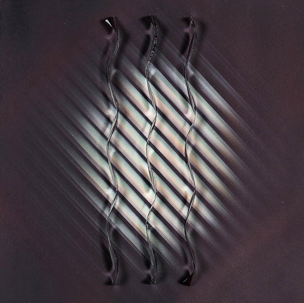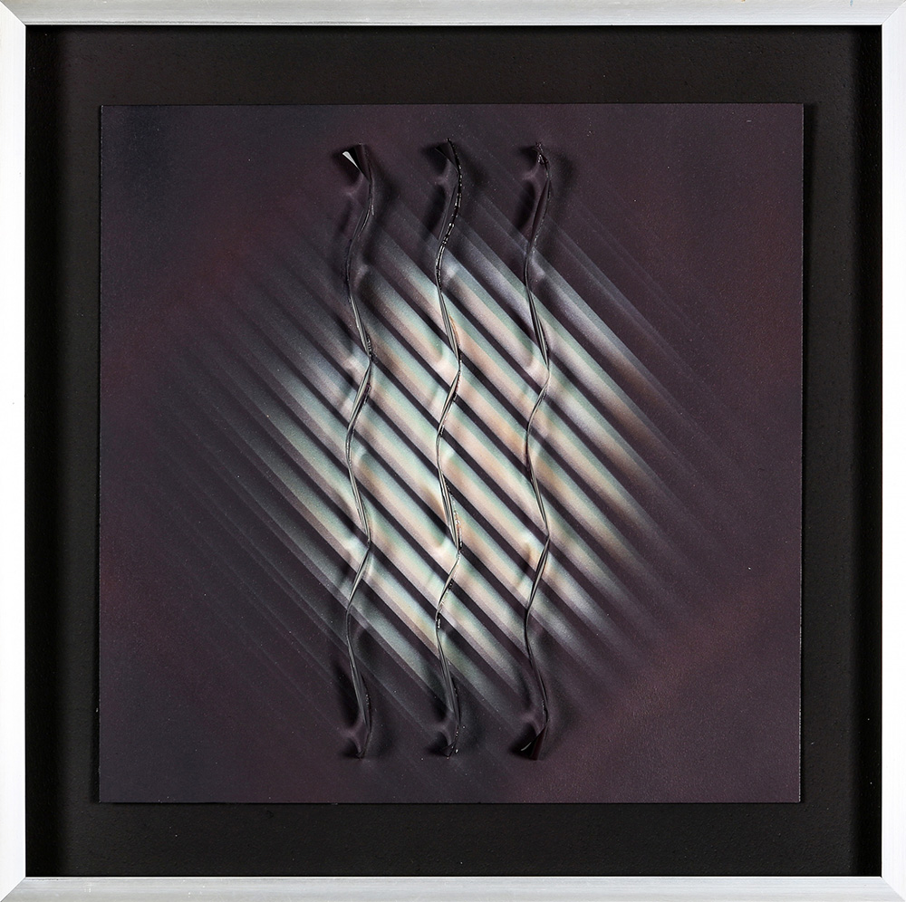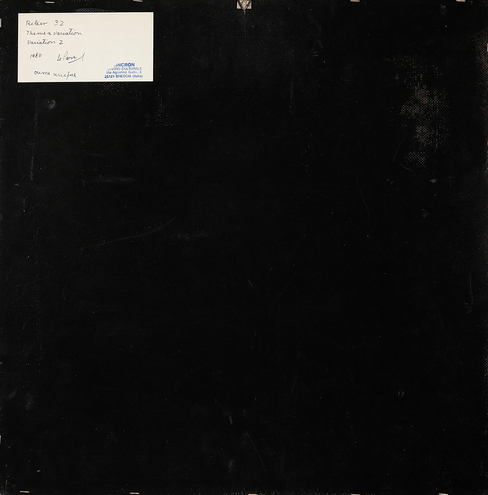 JULIO LE PARC 1928 Relief 32-Theme a variation-Variation 2, 1980 Assemblaggio, lamelle ondulate su cartone dipinto, cm. 39,5 x 39,5 Firmato e datato sul retro Timbro Sincron centro culturale, Brescia sul retro Opera unica Prov. Collezione Privata