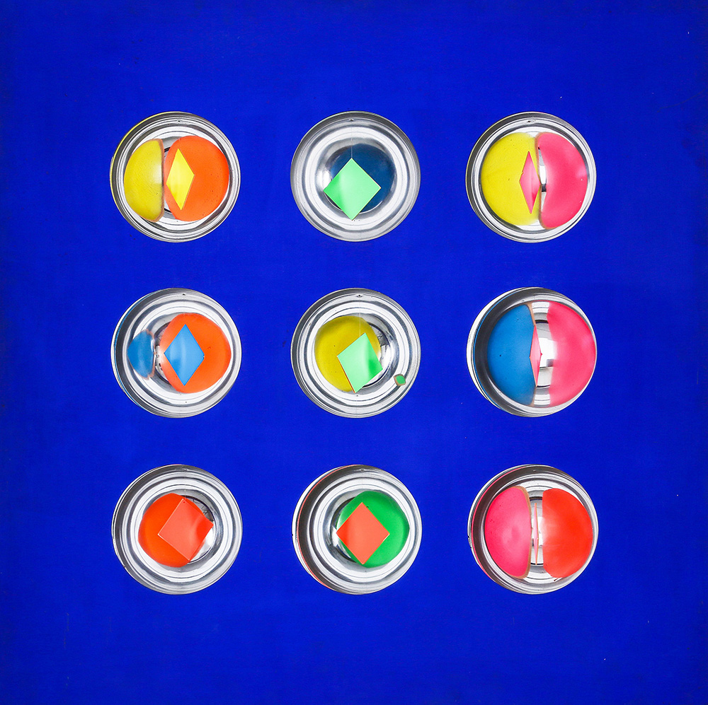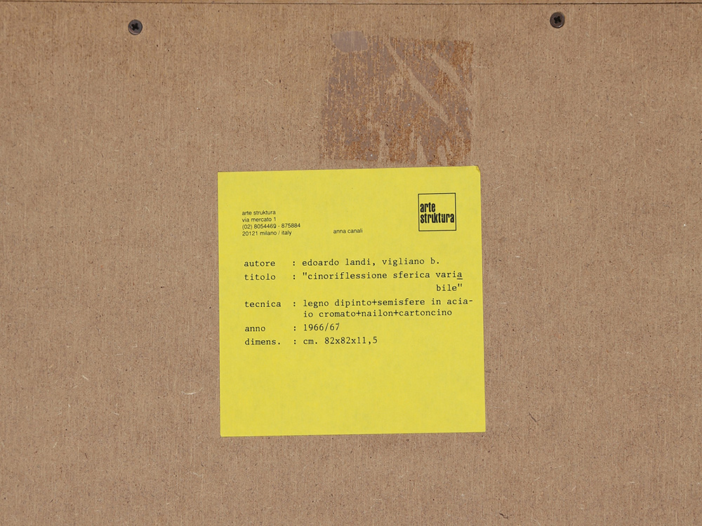 EDOARDO LANDI 1937 Cinoriflessione sferica variabile, 1966-67 Assemblaggio, 9 semisfere cromate e cartone in box di legno dipinto cm. 82 x 82 x 11 Firmato e datato sul retro Timbro Gruppo N sul retro Etichetta Arte Struktura, Milano sul retro Prov. Collezione Privata