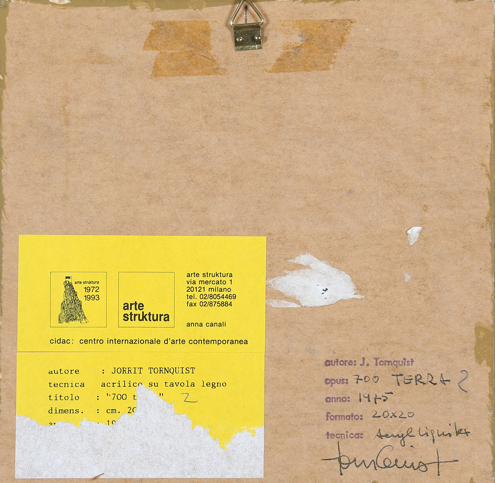 JORRIT TORNQUIST 1938 Opus 700 Terra 2, 1975 Acrilico liquitex su tavola, cm. 20 x 20 Firmato e datato sul retro Timbro dell’artista sul retro Etichetta Arte Struktura, Milano sul retro Prov. Collezione Privata