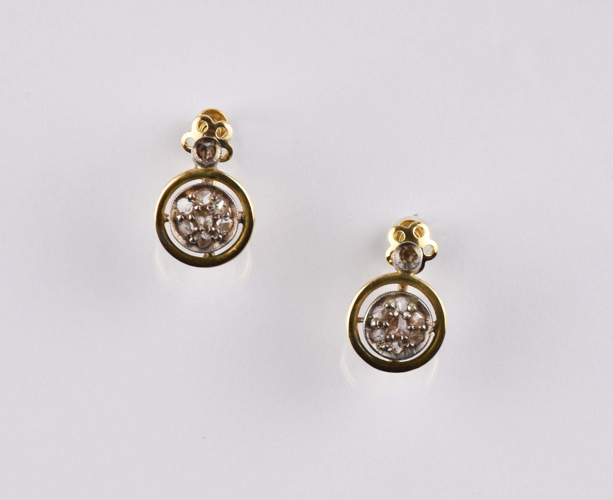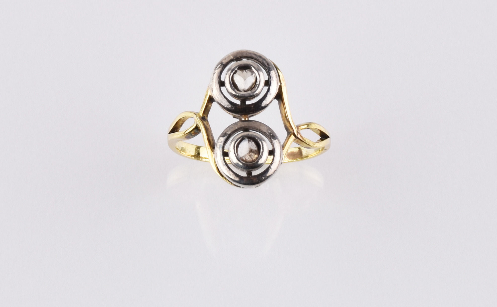DEMI PARURE COMPOSTA DI ANELLO E PAIO DI ORECCHINI IN ORO GIALLO, ARGENTO E DIAMANTI l’anello in oro giallo decorato al centro da piccoli diamanti taglio rosa entro castone traforato in argento, mis. 12; paio di orecchini analogamente decorati, diam. cm 1 Stato di conservazione complessivo ottimo. A RING AND A PAIR OF EARRINGS EN SUITE IN YELLOW GOLD, SILVER AND DIAMONDS Overall excellent condition.