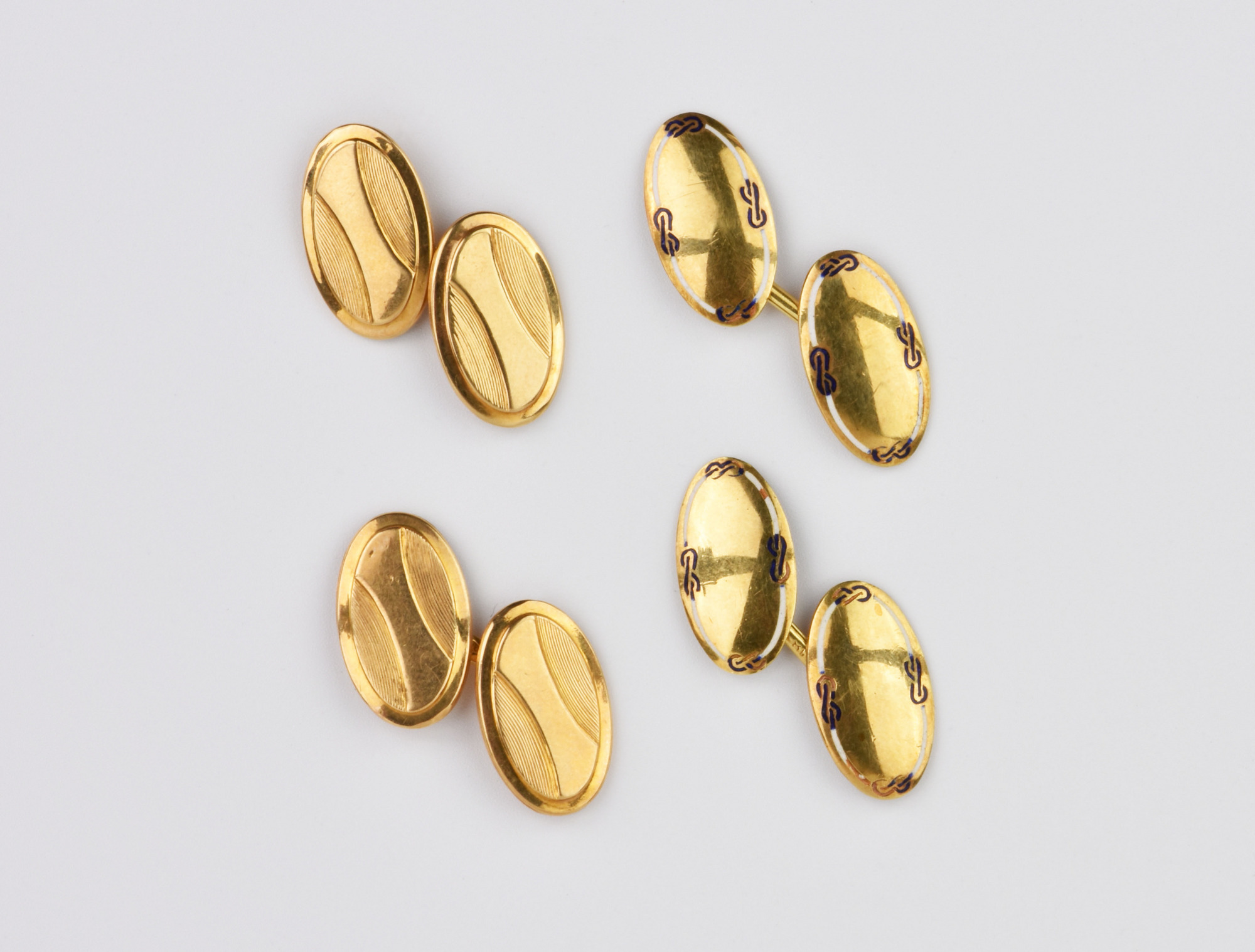 DUE PAIA DI GEMELLI IN ORO ROSA, ORO GIALLO E SMALTI un paio realizzato con due elementi ovali in oro rosa sbalzato e cesellato, punzoni FAO e 750; l’altro paio realizzato con due elementi ovali in oro giallo e motivo a nodi marinari in smalti bianchi e blu, punzone 18k Stato di conservazione complessivo molto buono. Alcune mancanze negli smalti. TWO PAIR OF ROSE GOLD, YELLOW GOLD AND ENAMEL CUFFLINKS Overall very good conditions. Enamel presents some missing parts.