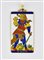 PENDENTE IN ORO GIALLO E SMALTI POLICROMI modellato a forma di carta da gioco raffigurante ‘il matto’, la parte anteriore decorata in smalti policromi, quella posteriore in oro cesellato, punzone 750, dim. cm 7x3,3 Stato di conservazione complessivo ottimo. Una scheggiatura superficiale sul lato sinistro. MULTICOLOUR ENAMEL AND YELLOW GOLD ‘THE FOOL’ CARD PENDANT Overall excellent conditions. A minor chip on the left side.