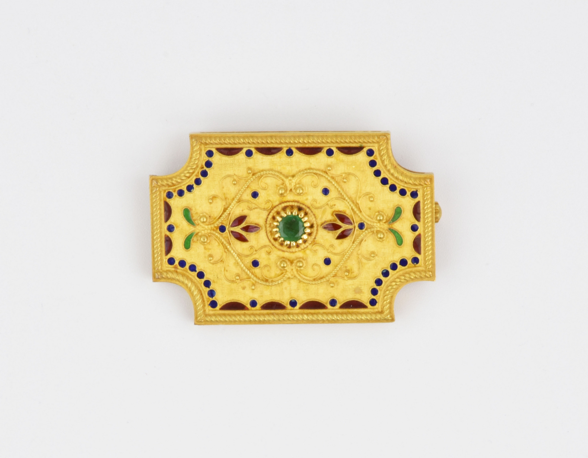 SPILLA IN ORO GIALLO, SMALTI POLICROMI E SMERALDO disegnata come una placca...