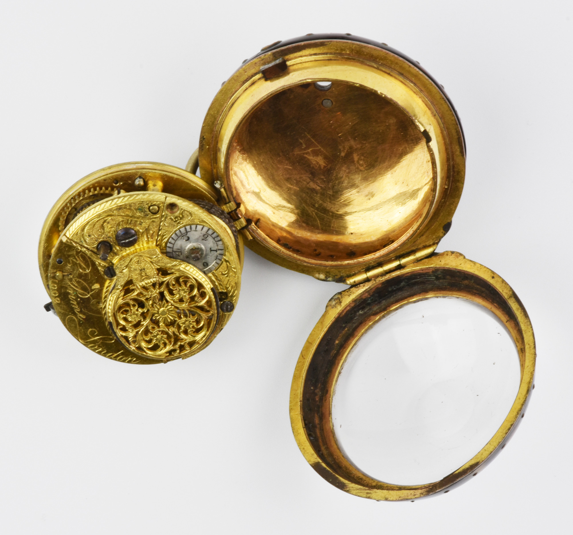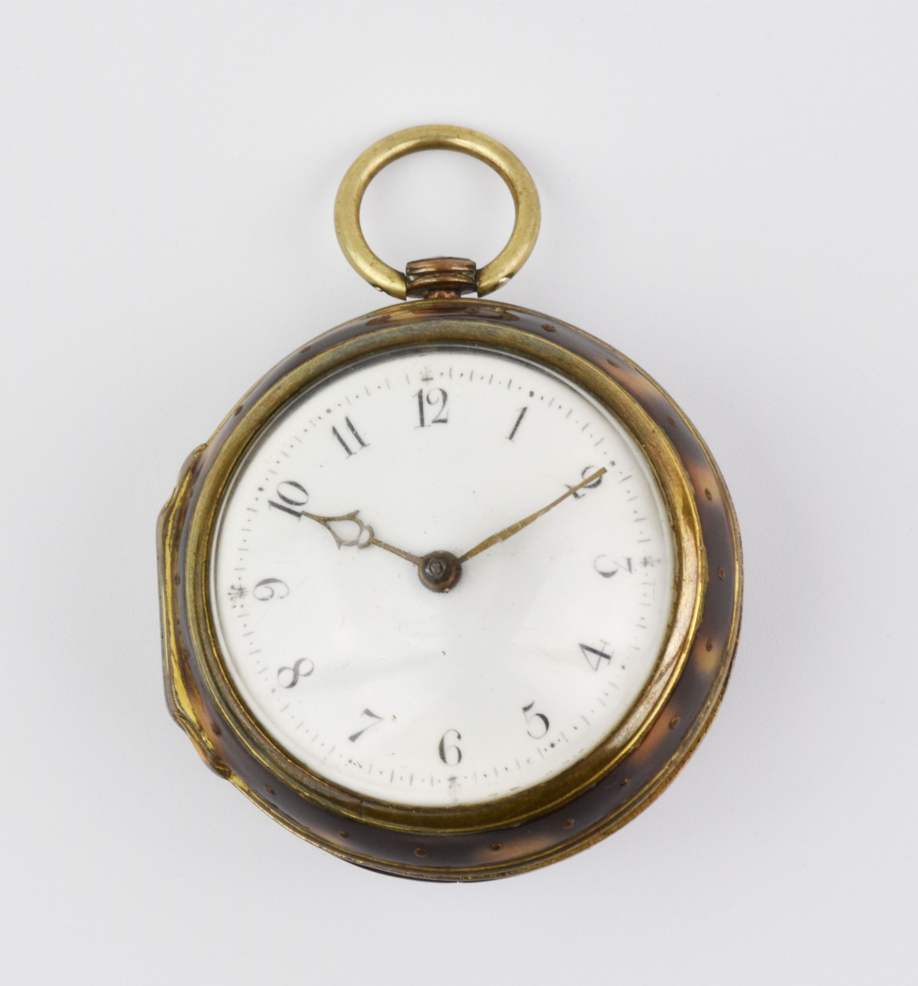 OROLOGIO DA TASCA, R. PRIME, LONDON, MOV. N. 1002, IN METALLO DORATO E ORO 18 K CASSA: Doppia rivestita ad effetto tartaruga con finiture e piccole borchie in metallo dorato, interno in oro QUADRANTE: in smalto bianco con numeri arabi MOVIMENTO: firmato e finemente cesellato, scappamento a verga DIAM.: mm 52 A METAL GILDED AND 18 K YELLOW GOLD POCKET WATCH, R. PRIME, LONDON, MOV. N. 10002 DIAM.: 52 mm Il rivestimento della cassa presenta alcune fratture. Quadrante in condizioni molto buone. Movimento non funzionante, da revisionare