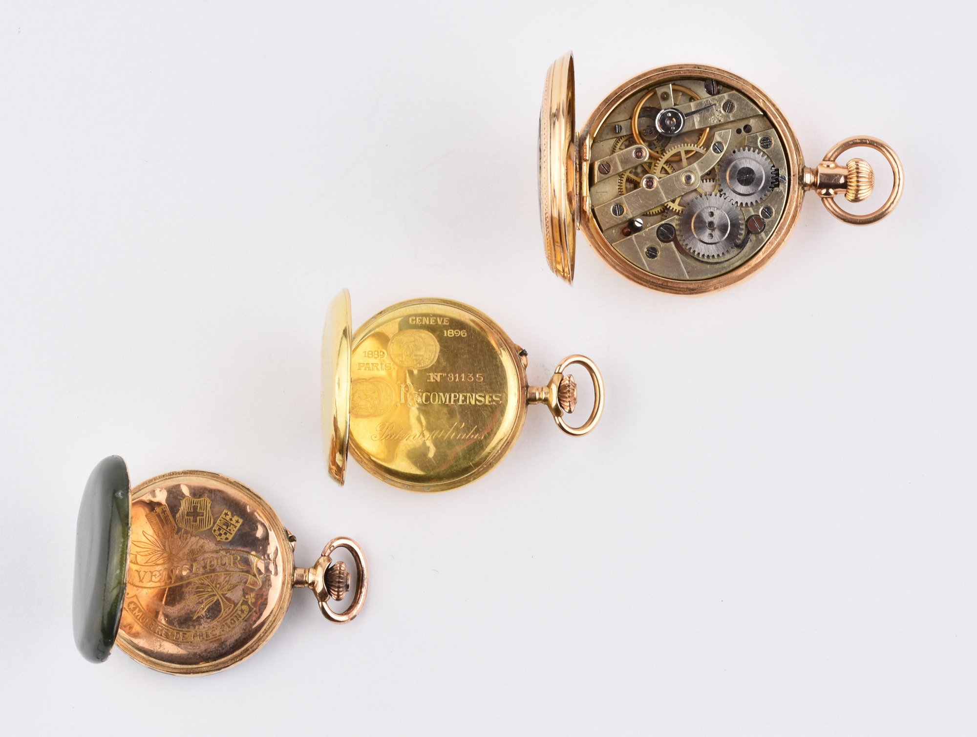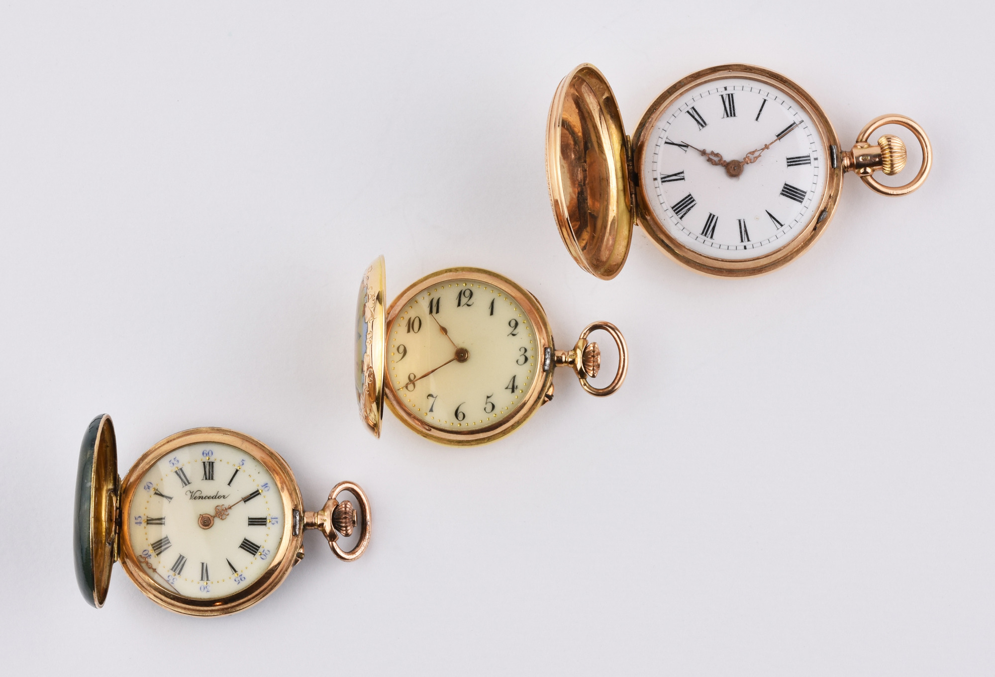 TRE OROLOGI DA TASCA IN ORO 18 K, SMALTI E ROSE DI DIAMANTE, DI CUI DUE DI...