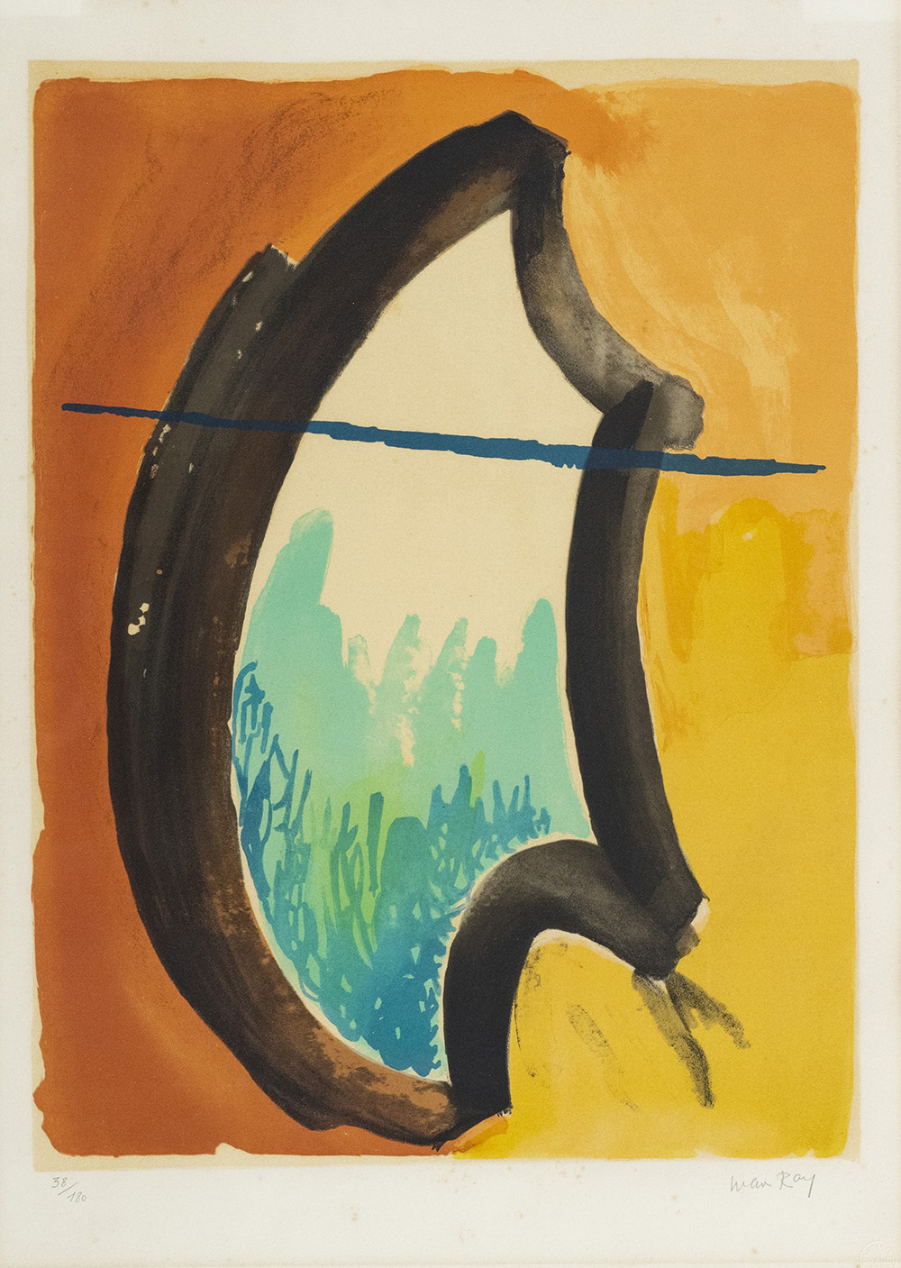 Man Ray (Philadelphia 1890 Parigi 1976) De l'origine de l'espece 1971, Litografia su carta, cm. 50x36, es. 38/180., Firma e timbro a secco "Libreria Prandi Reggio Emilia" in basso a destra, tiratura in basso a sinistra. L'opera fa' parte della cartella di 10 Litografie "L'origine dell' espace", tirate a Parigi dalla stamperia Mourlot.