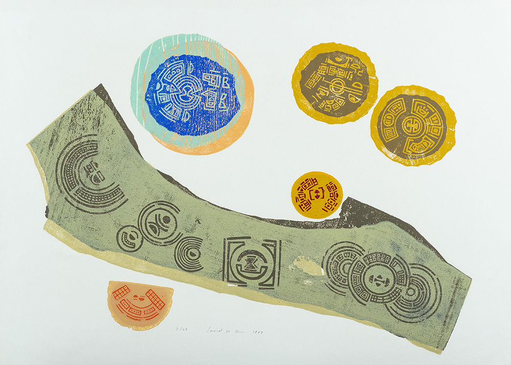 Seund Ja Rhee (Sud Corea 1918 2009) Les boxbs effrangés du bonheur 1969, Serigrafia materica, cm. 57x76,5, es. 3/29., Firma, data e tiratura in basso al centro. sul verso: titolo.
