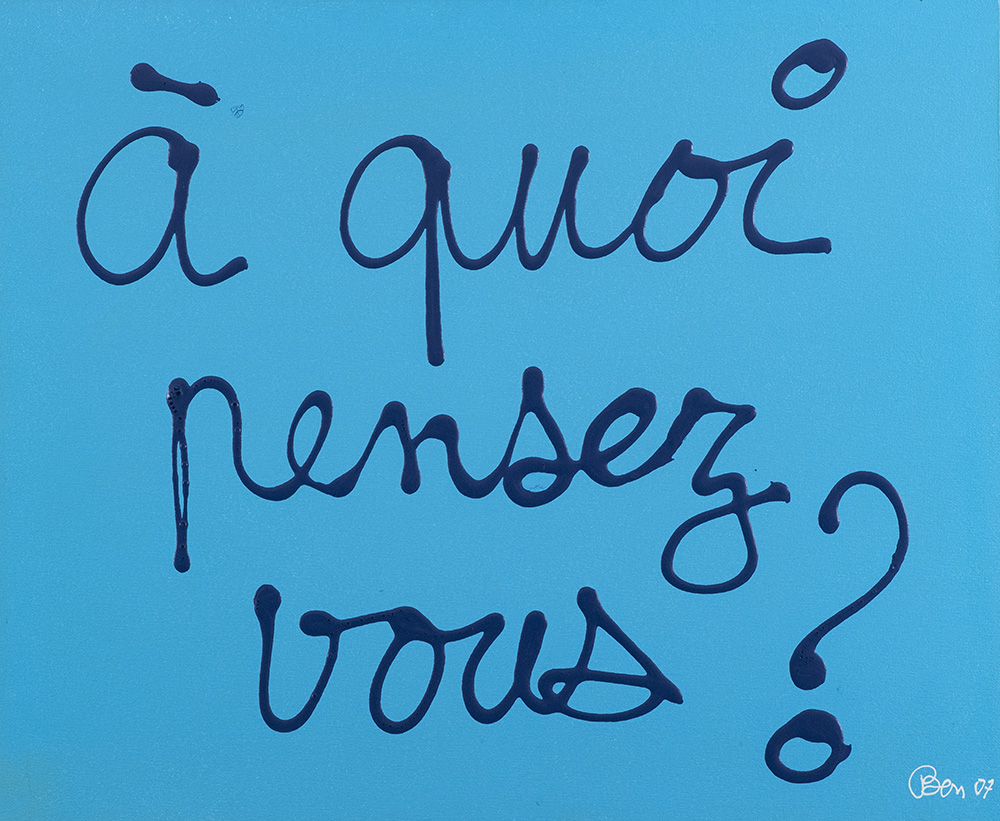 Ben Vautier (Napoli 1935 ) A quoi penser vous? 2007, Acrilico su tela, cm. 54x65, in teca di plexiglass, Firma e data in basso a destra. Sul verso: firma e titolo. Autentica dell'Artista su foto.