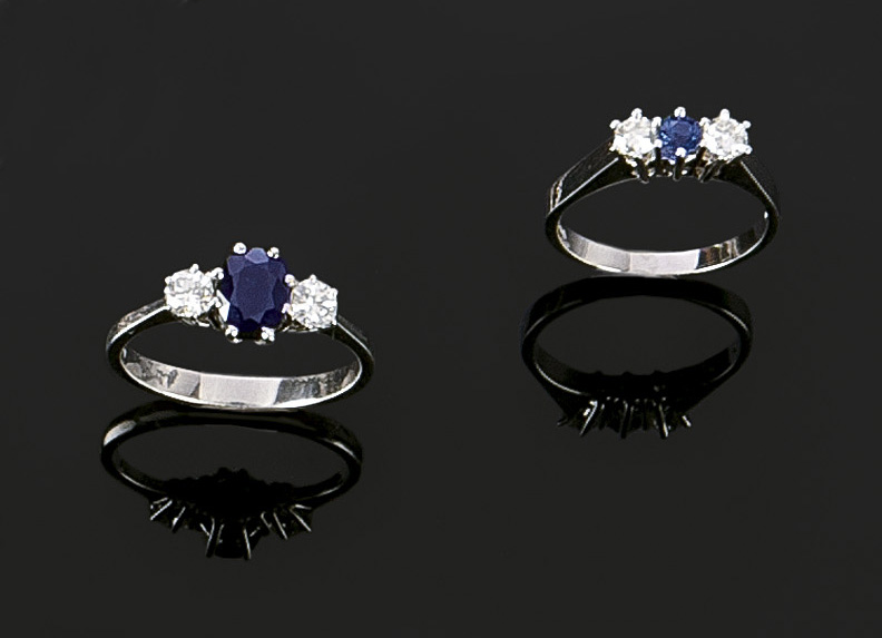 DUE ANELLI Lotto composto da due anelli in oro bianco: il primo con zaffiro centrale di taglio ovale di ct 1,31 e ai lati due diamanti taglio brillante rotondo di ct 0,38 ca, peso gr. 3,00 Misura 15; il secondo con zaffiro centrale di taglio rotondo di ct 0,31 e ai lati due diamantini taglio brillante rotondo per complessivi ct 0,30 ca Peso gr. 3,2 Misura 11