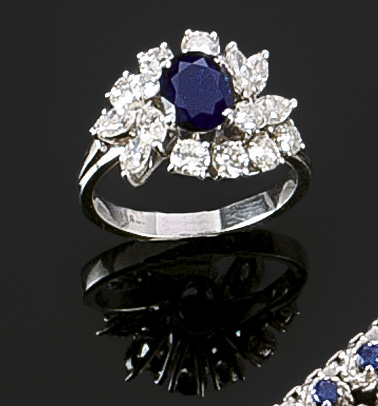 ANELLO Anello in oro bianco con zaffiro centrale di ct 1,40 ca e contorno di diamanti taglio brillante rotondo e taglio marquise per complessivi ct 1,70 ca Peso gr. 4,00 Misura 13