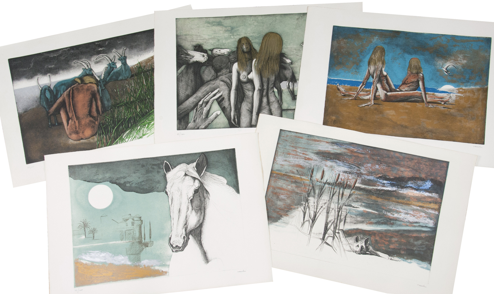 Sergio Vacchi Il pianeta Cartella contenente cinque acqueforti di cm. 40x55, su carta di cm. 50x70, es. 63/100, tutte firmate in basso a destra e tirate in basso a sinistra. La cartella è corredata da uno scritto introduttivo di Roberto Tassi. Le grafiche sono state realizzate in 100 esemplari numerati da 1 a 100 e 30 esemplari numerati da I/XXX, finite di stampare nel Giugno 1978, a tiratura ultimata le lastre sono state biffate alla presenza dell'Artista, dello stampatore e dell'Editore.