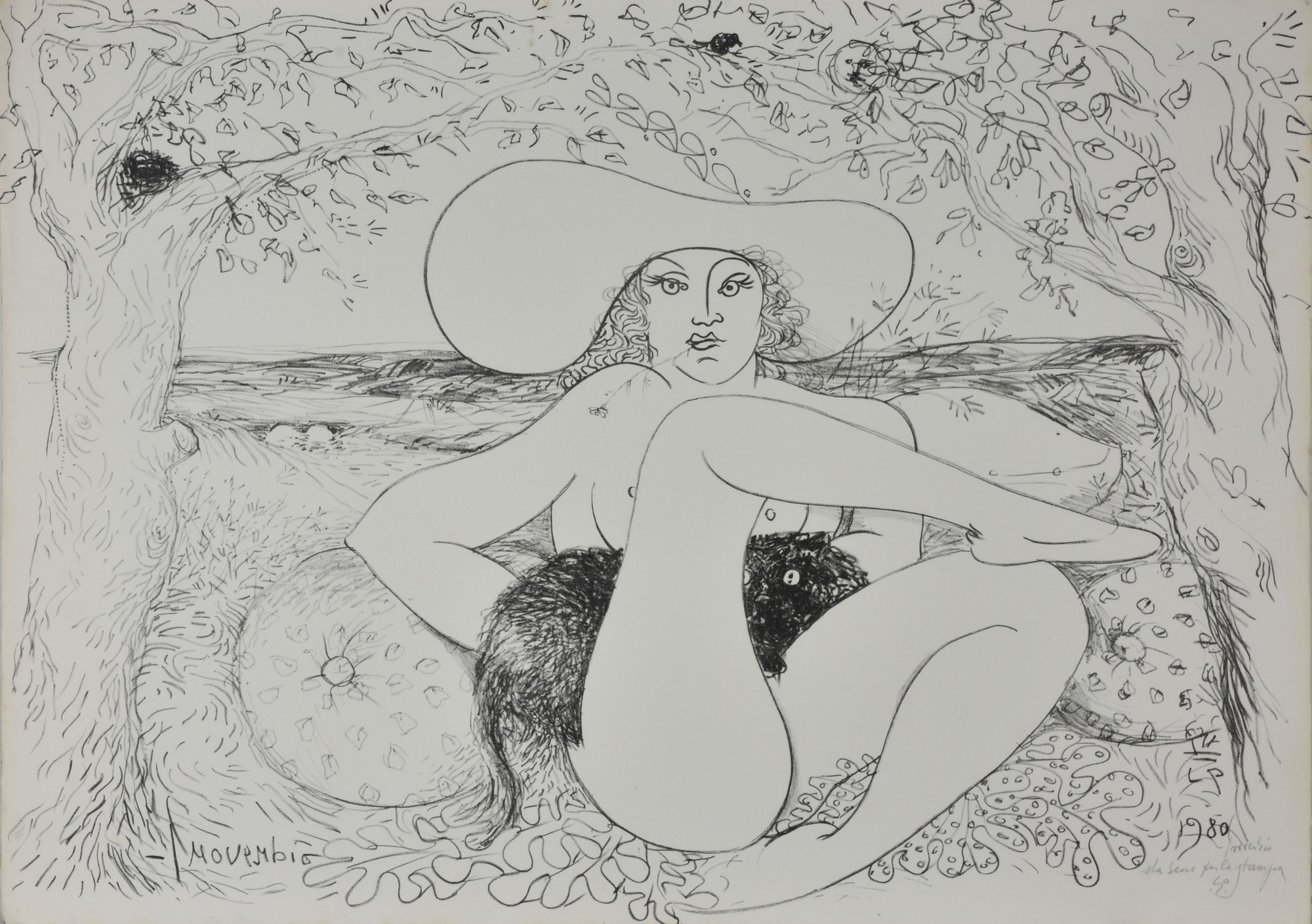Luciano Proverbio DONNA CON GATTO litografia a un colore, cm 50x70 esemplare sta bene per la stampa sul fronte: firma e data eseguita nel 1980