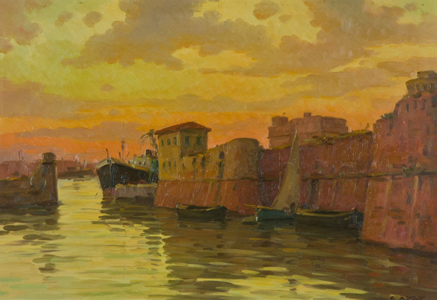 Sergio Difficili Porto di Livorno Olio su faesite, cm. 35x50 Firmato in basso...