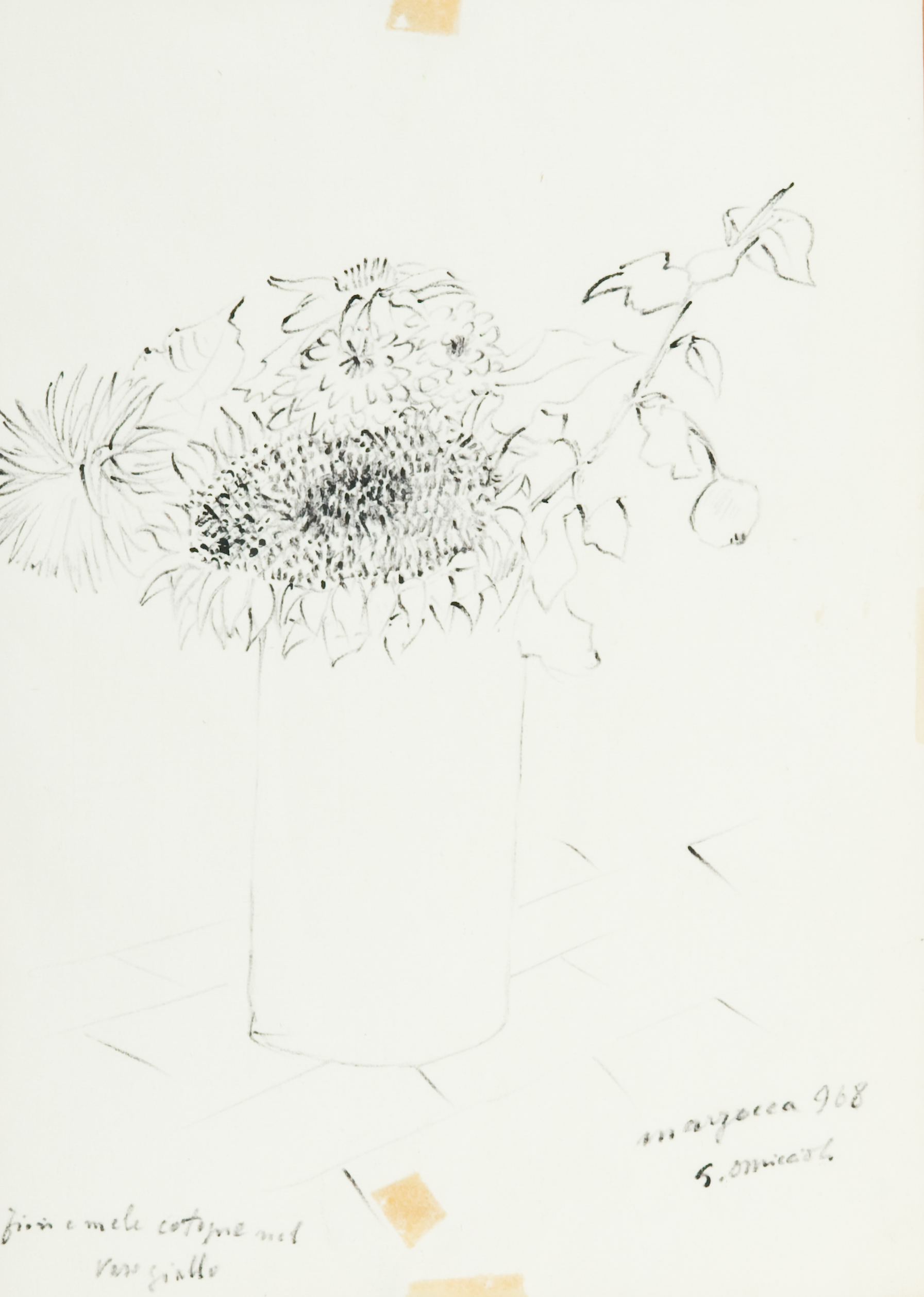 Giovanni Omiccioli Fiori e mele cotogne nel vaso giallo, 1968 Pennarello su carta, cm. 41x29,5 La carta presenta imperfezioni. Firma e data in basso a destra, titolo in basso a sinistra.
